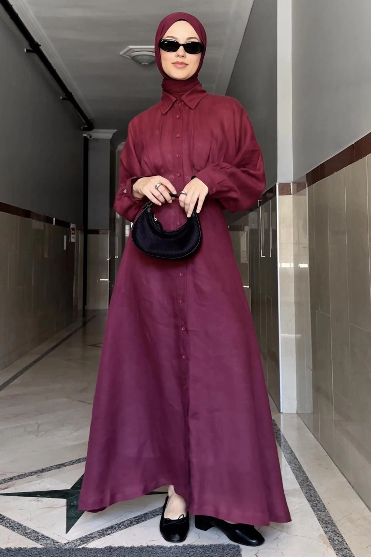 %100 Keten Reglan Kol Düğmeli Bordo Elbise