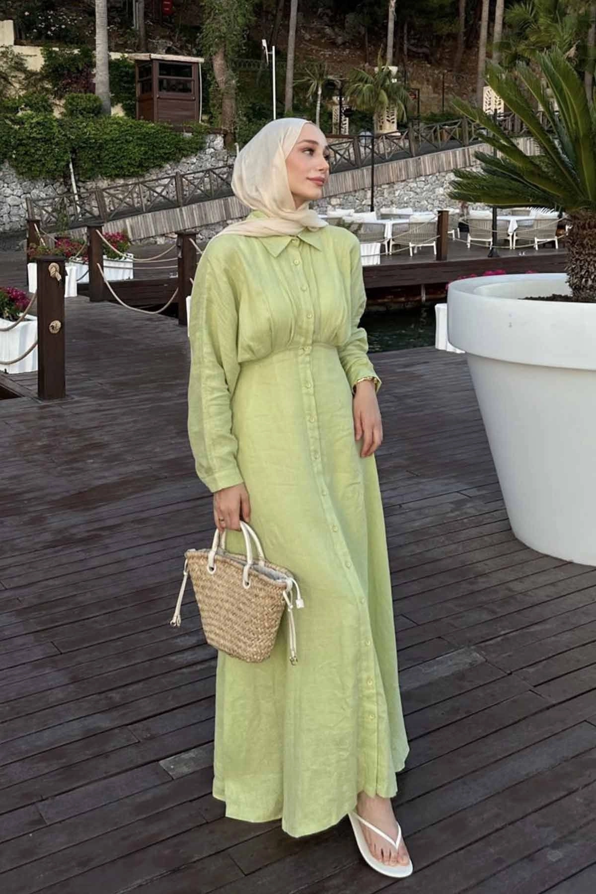 %100 Keten Reglan Kol Düğmeli Elma Yeşili Elbise