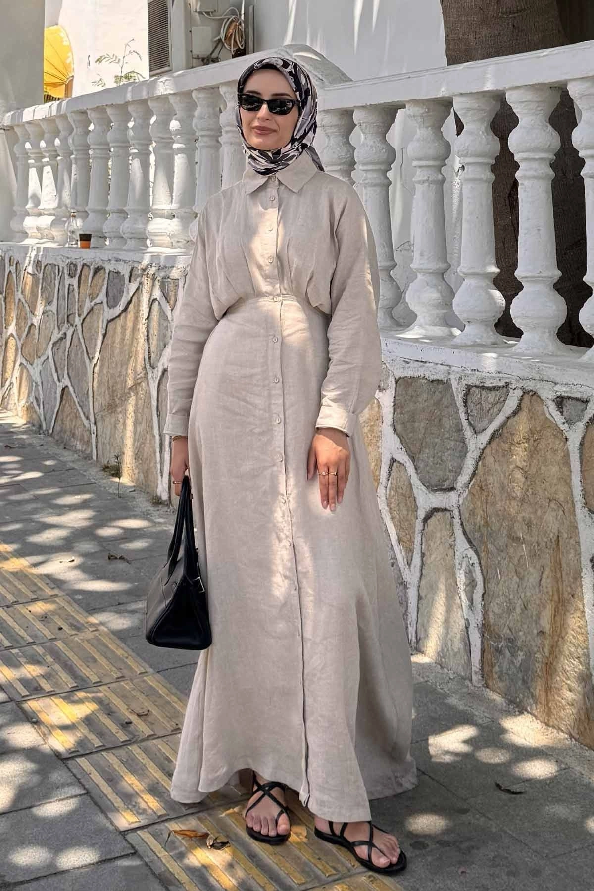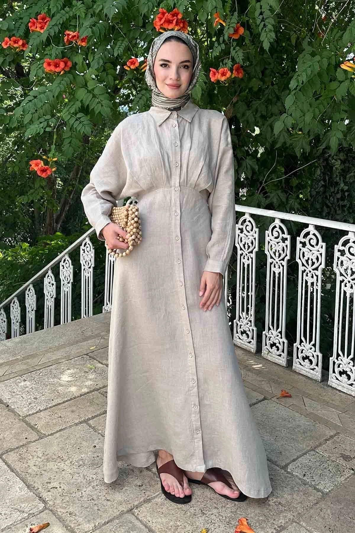 %100 Keten Reglan Kol Düğmeli Taş Elbise
