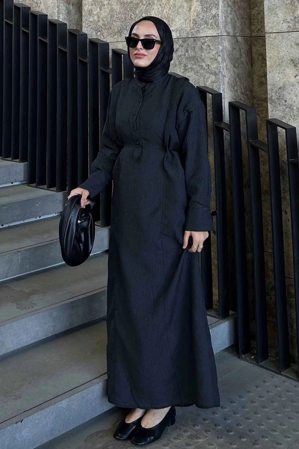 Aller Kol Detaylı Dokulu Siyah Elbise
