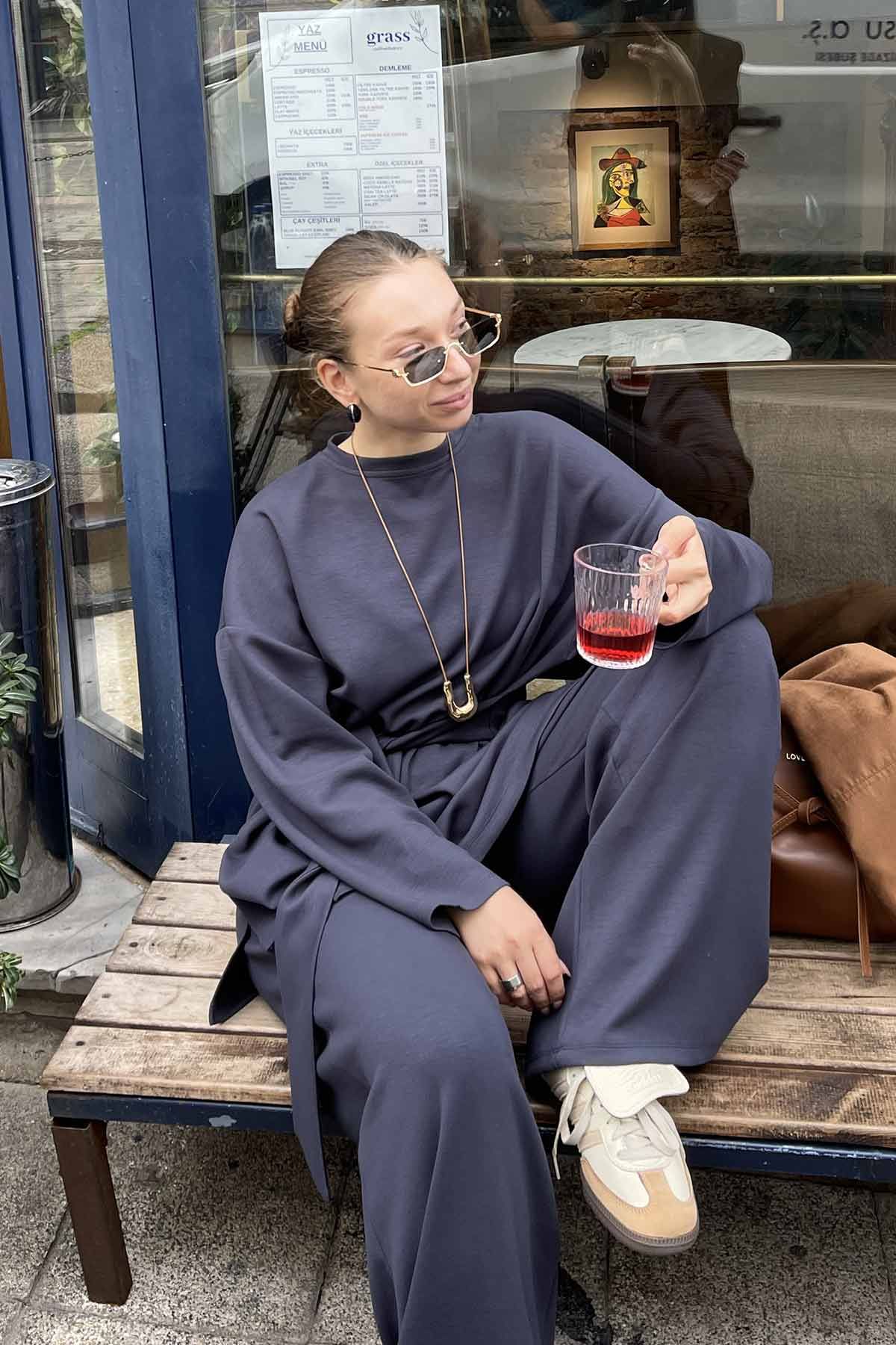 Belden Bağlama Detaylı Rahat Kesim Lacivert Pantolon Takım
