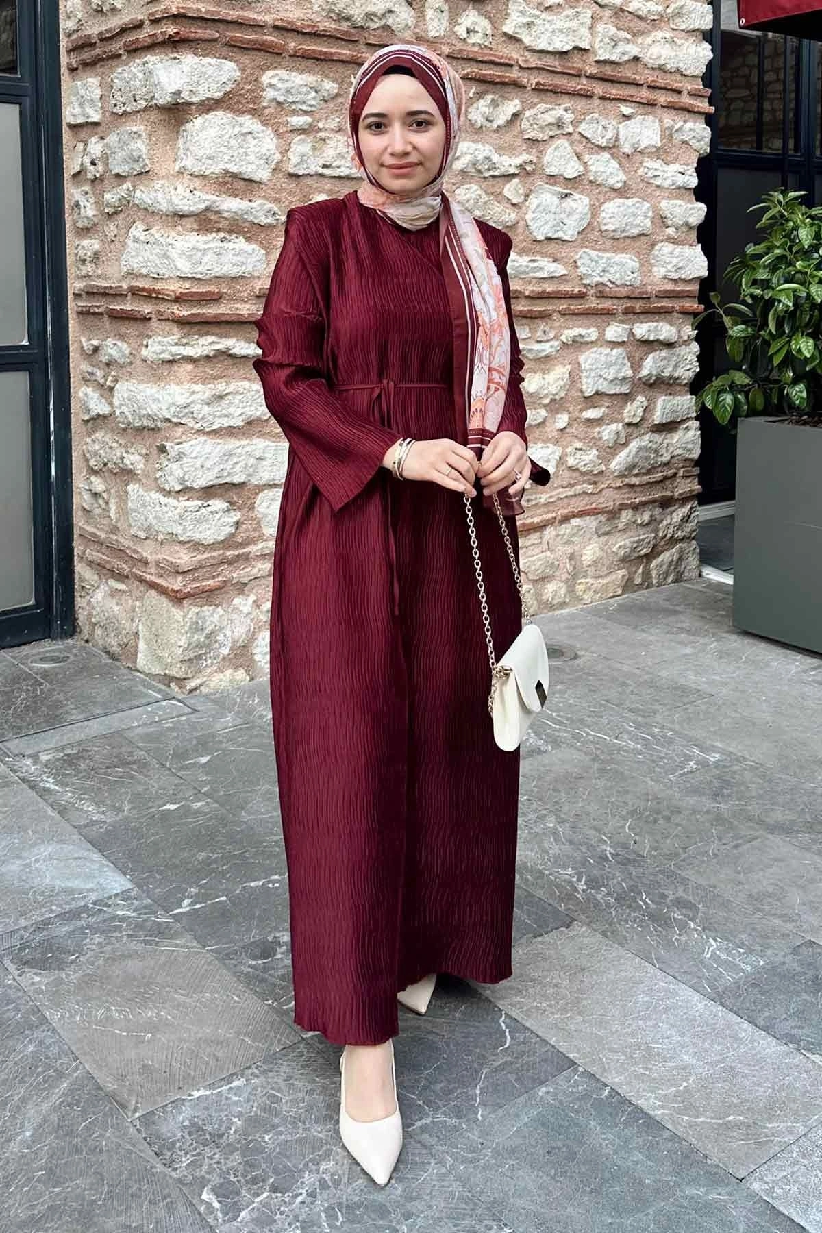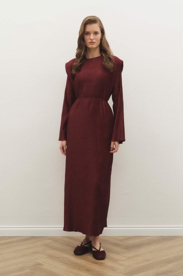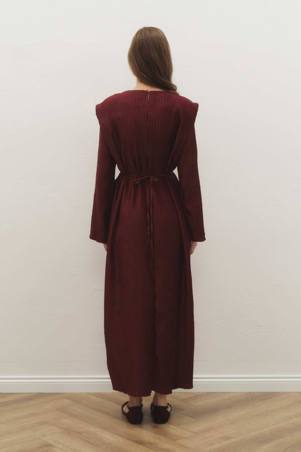 Aller Detaylı Dokulu Bordo Saten Elbise