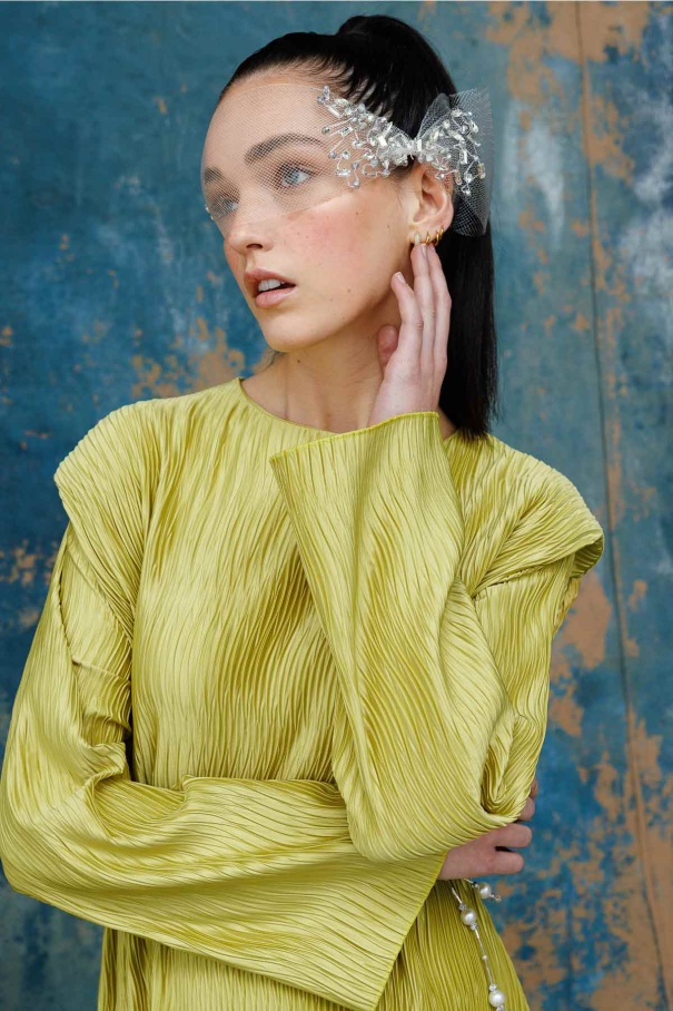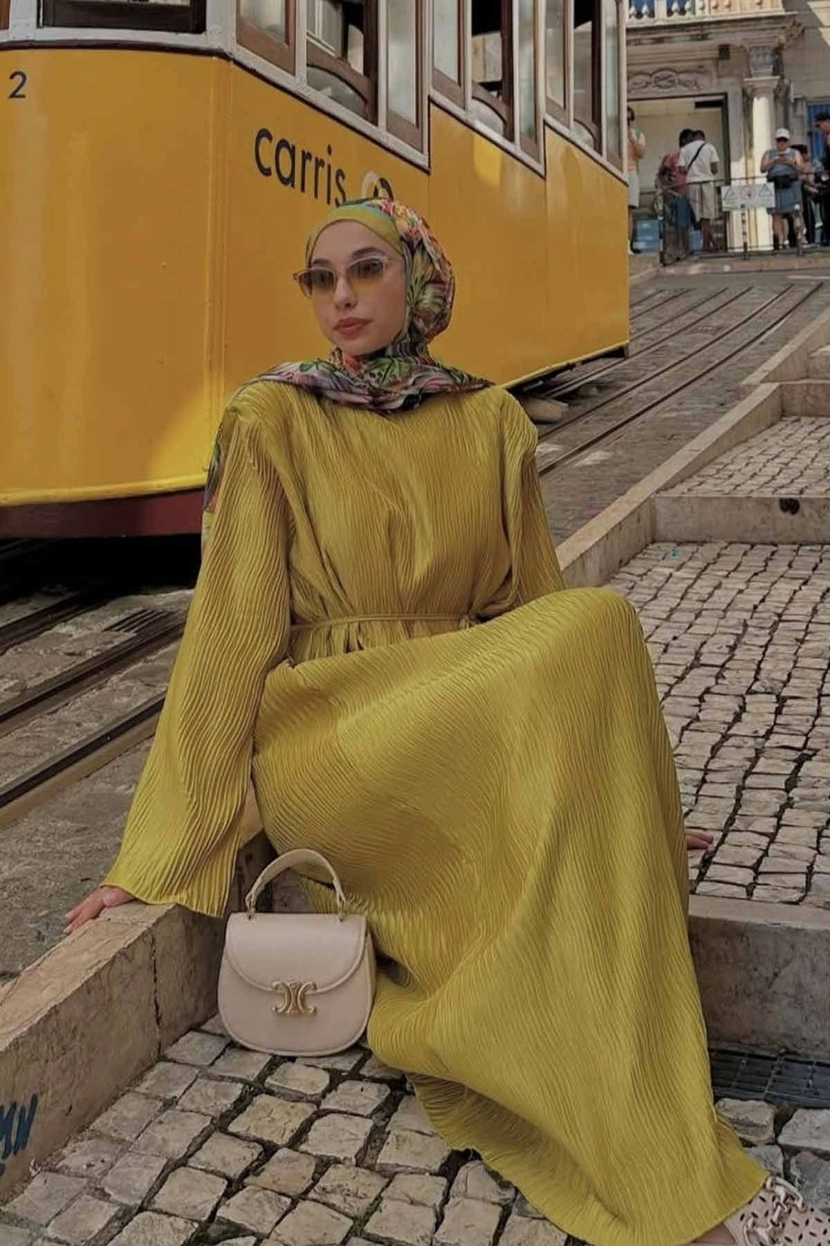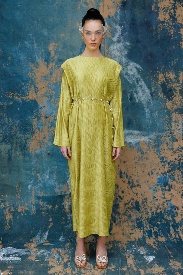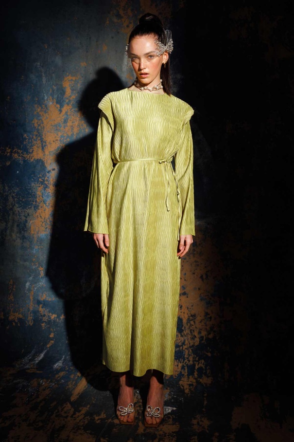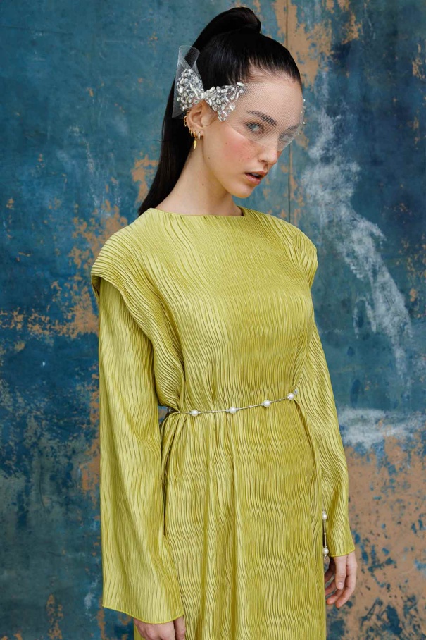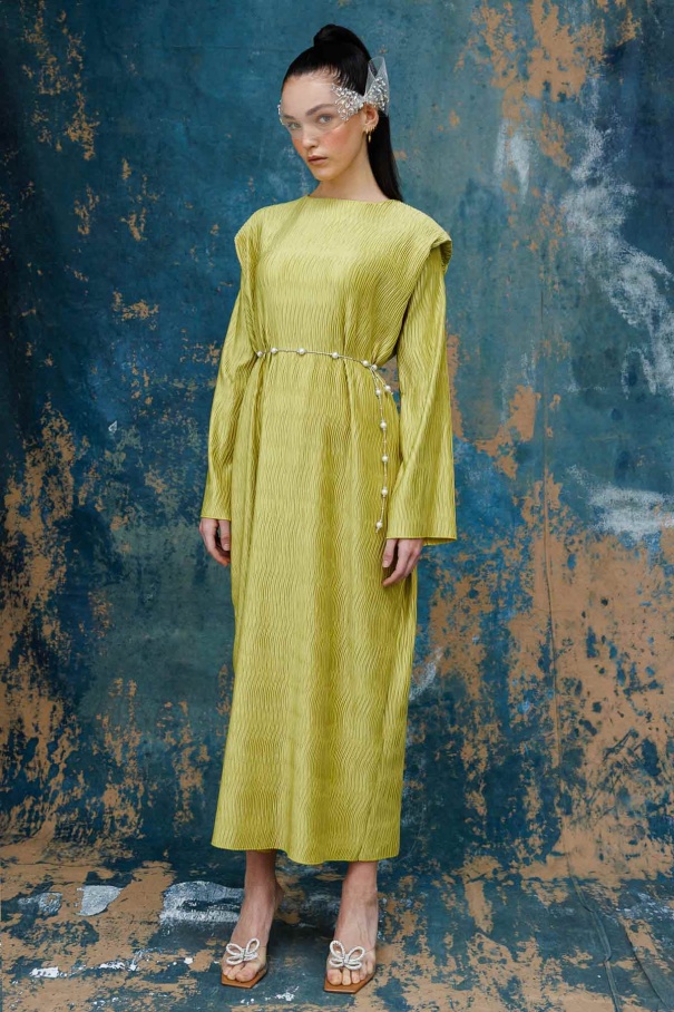 Aller Detaylı Dokulu Saten Yağ Yeşili Elbise