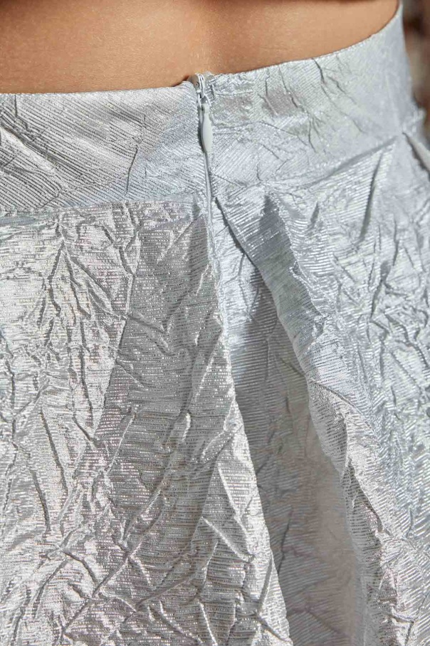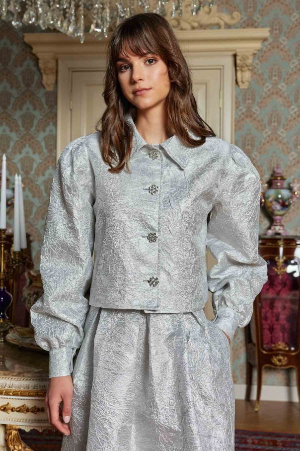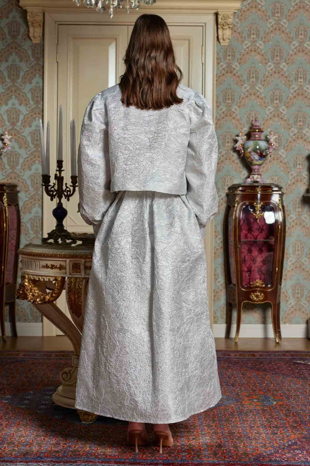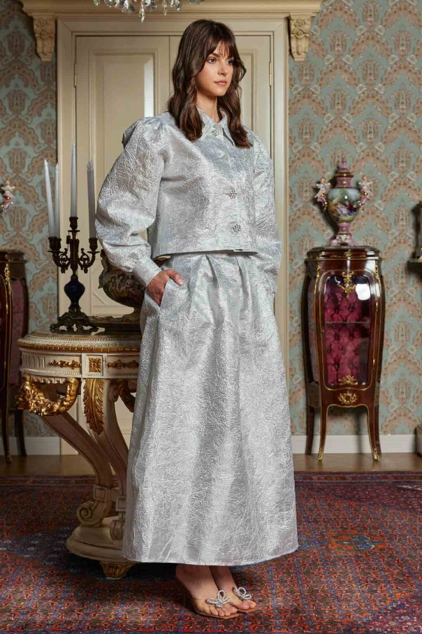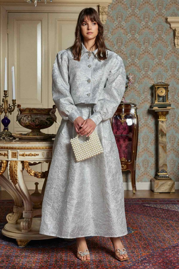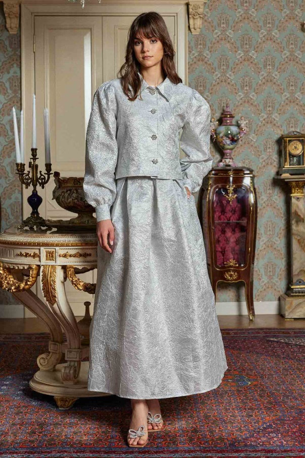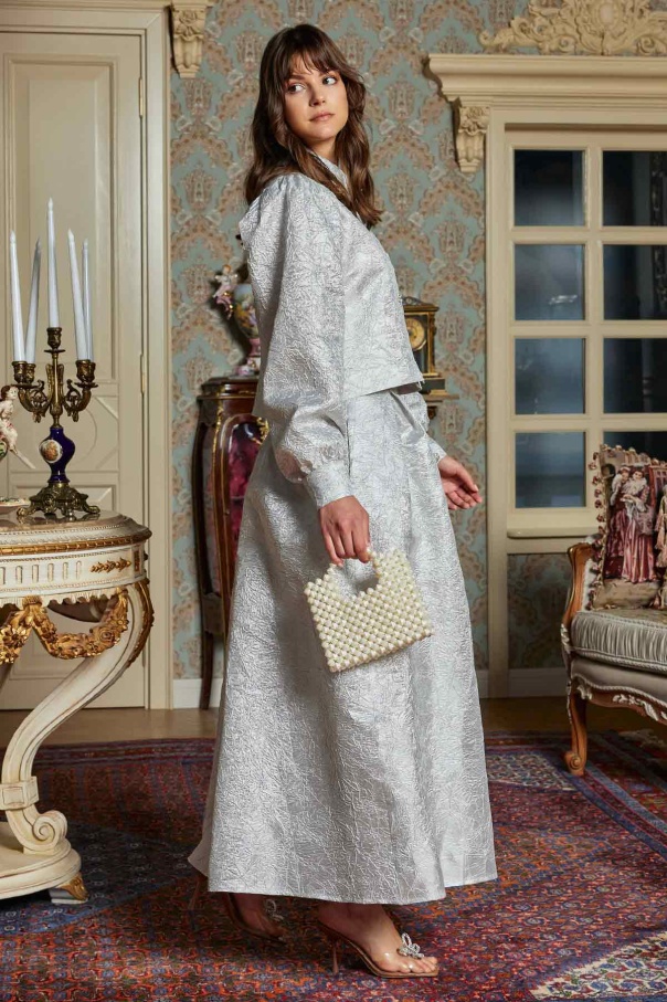 Taş Düğmeli Gri Brokar Etekli Takım