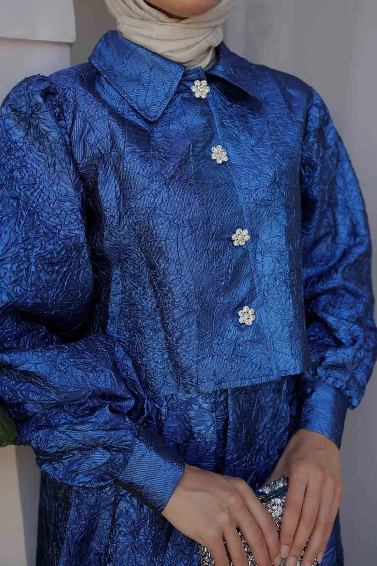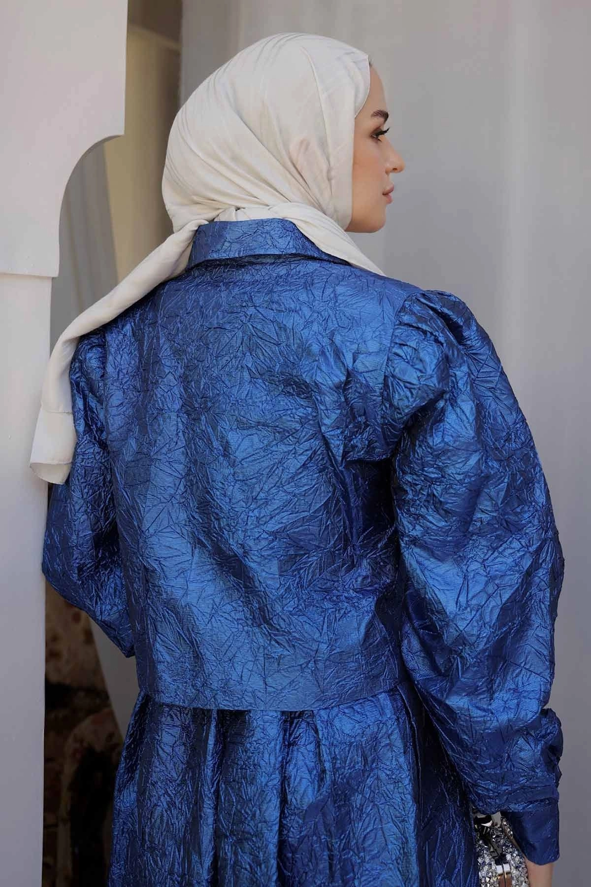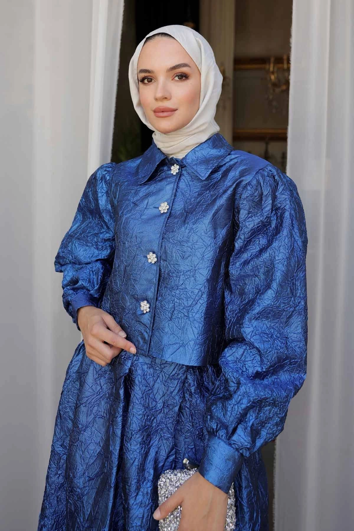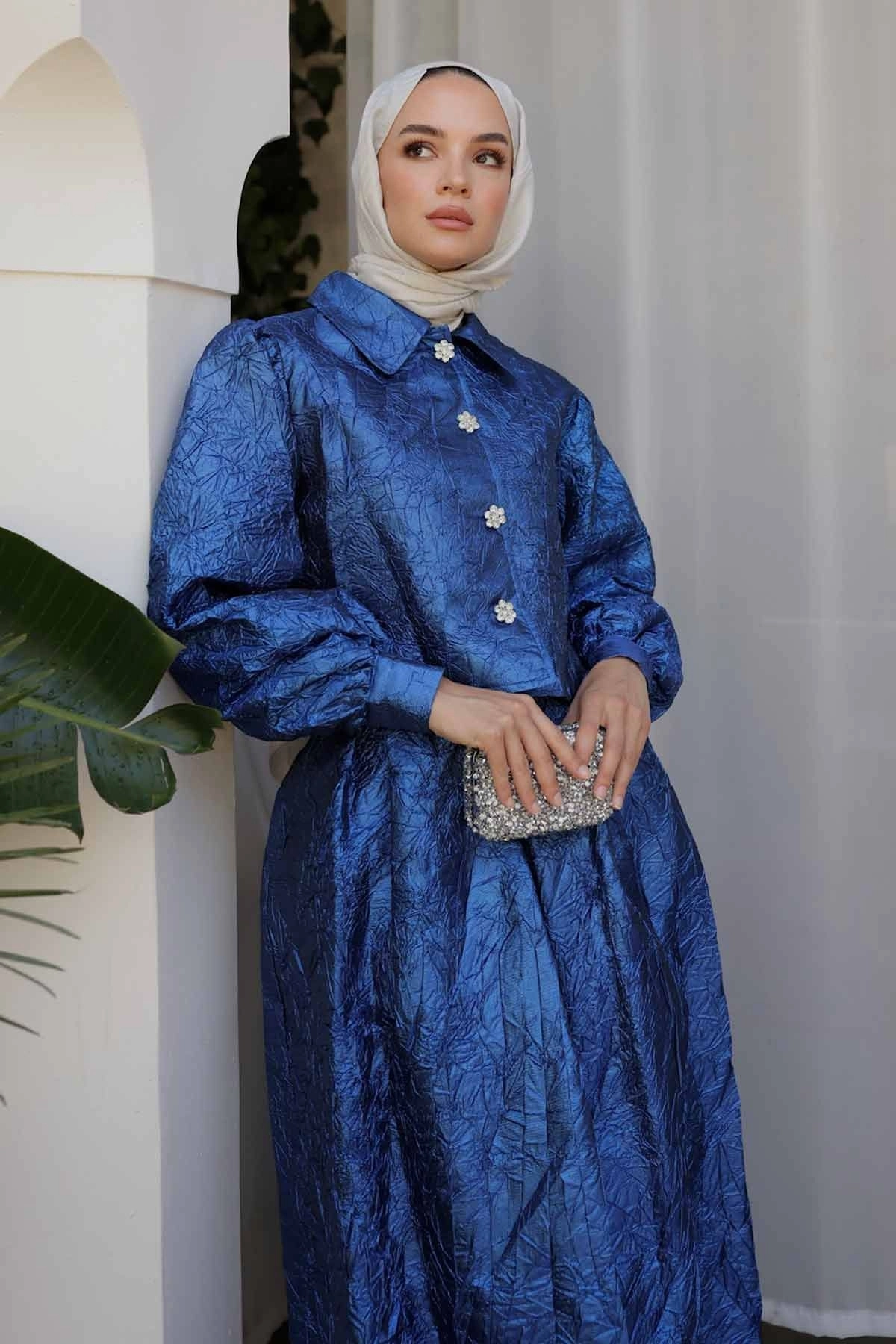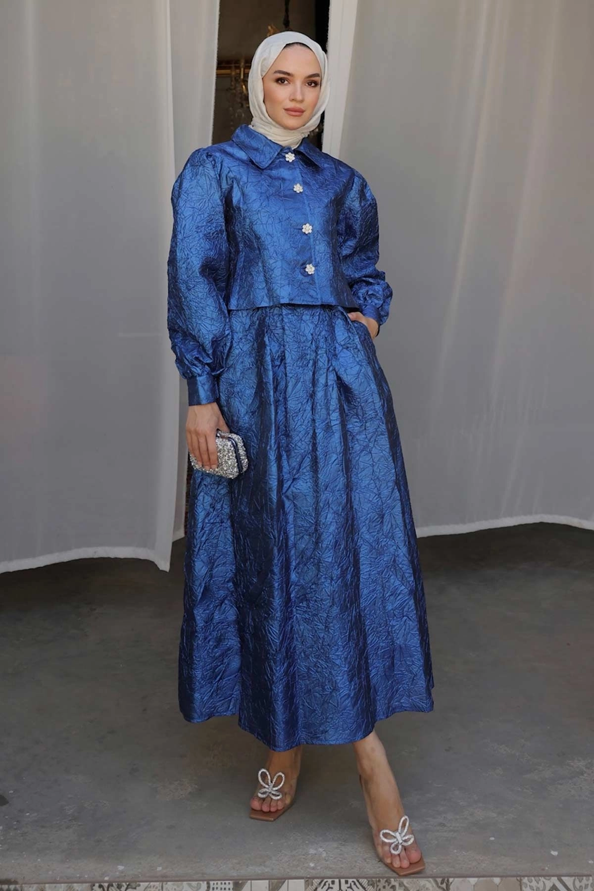 Taş Düğmeli Saks Mavisi Brokar Etekli Takım