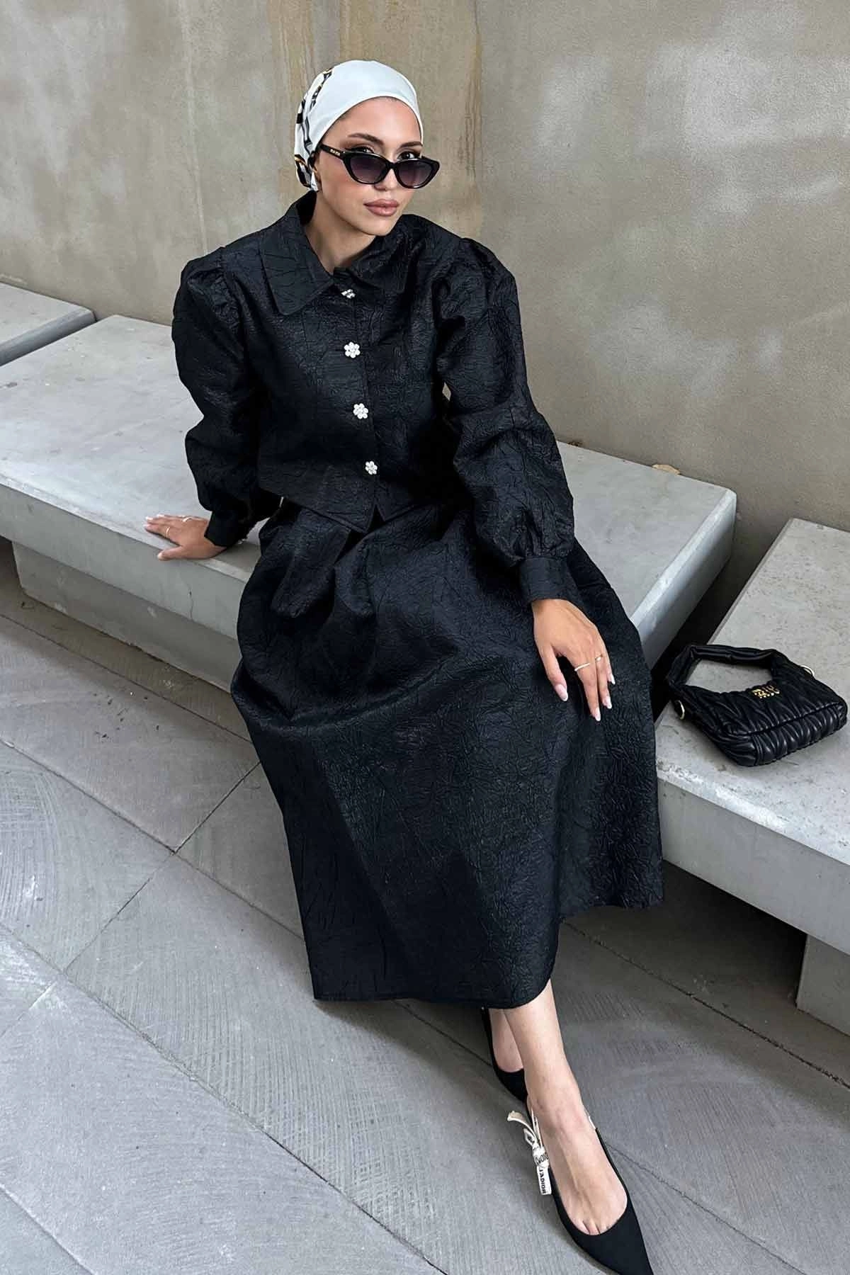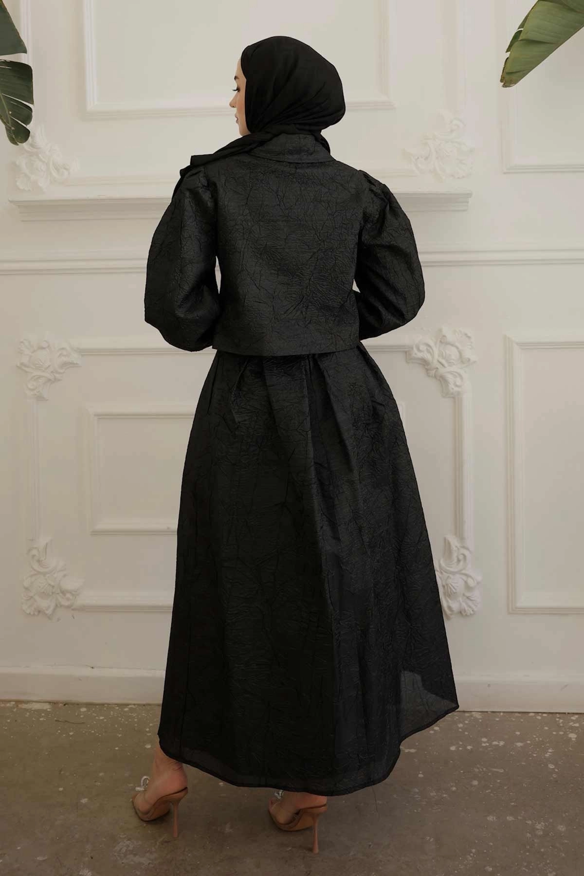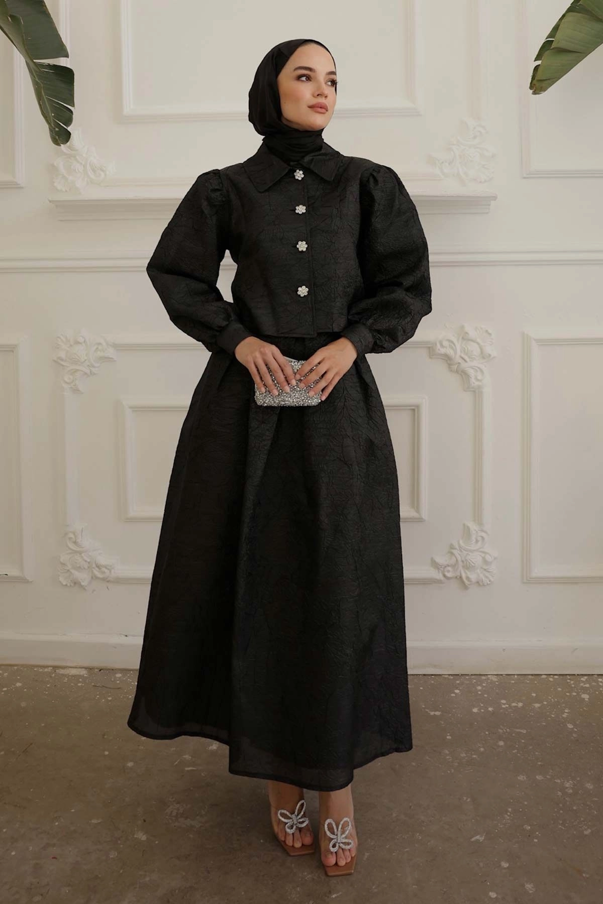 Taş Düğmeli Siyah Brokar Etekli Takım