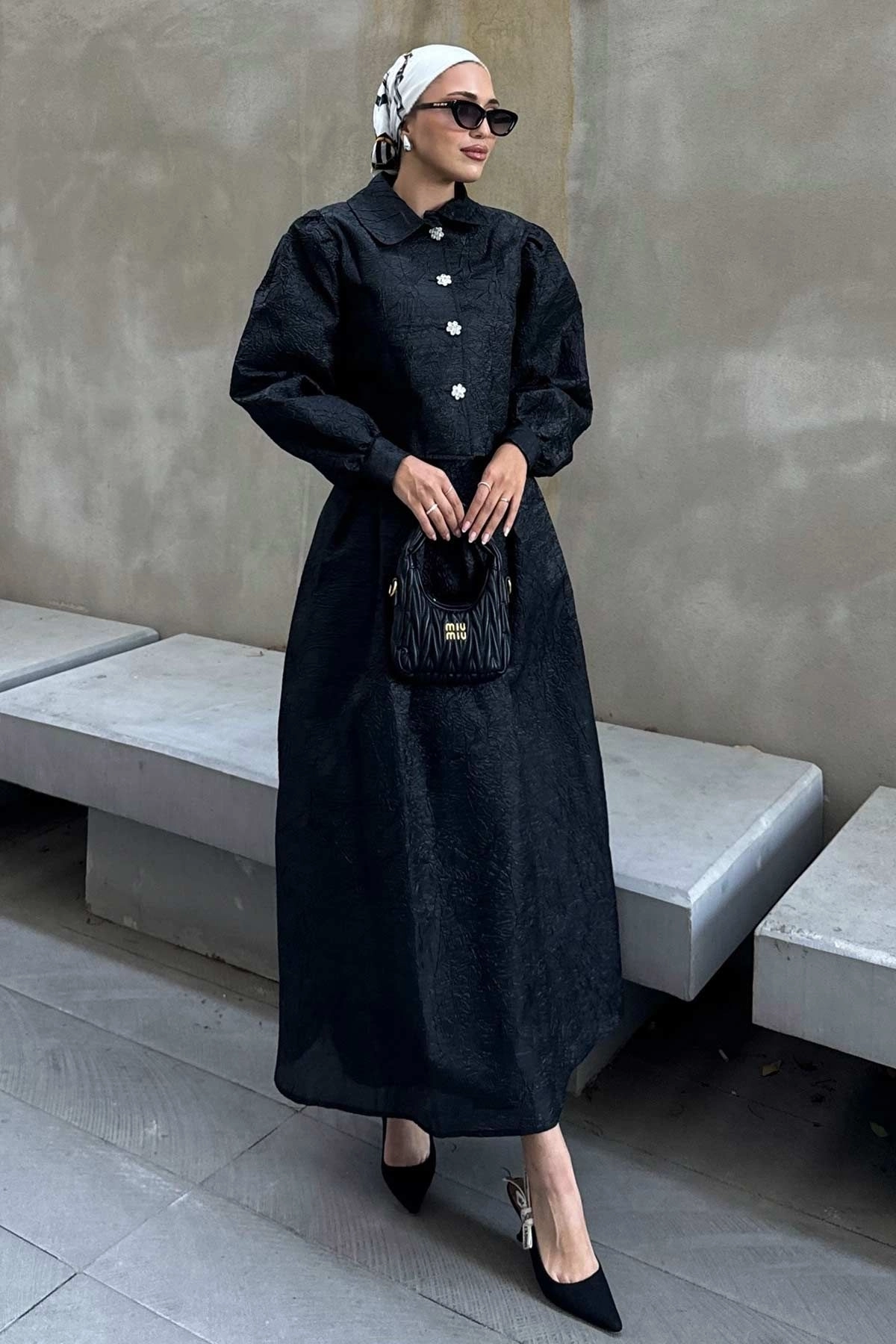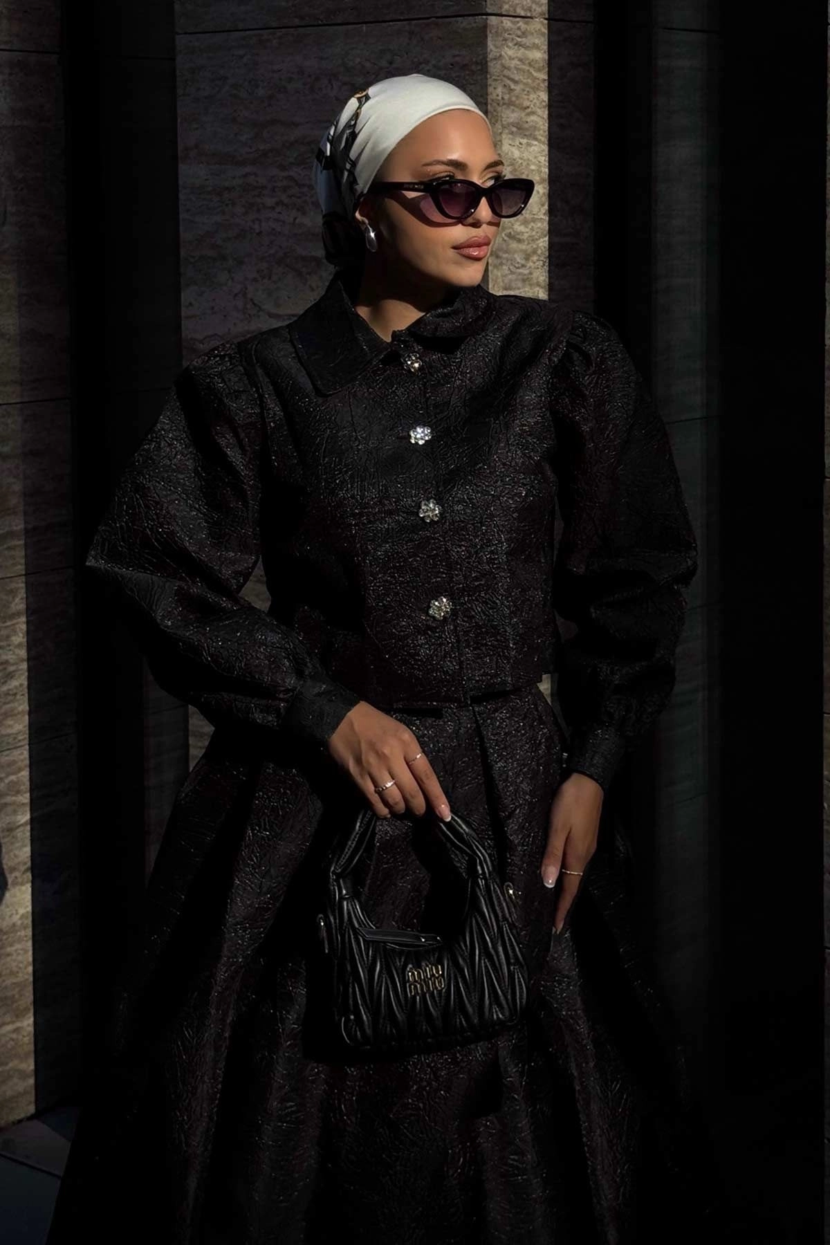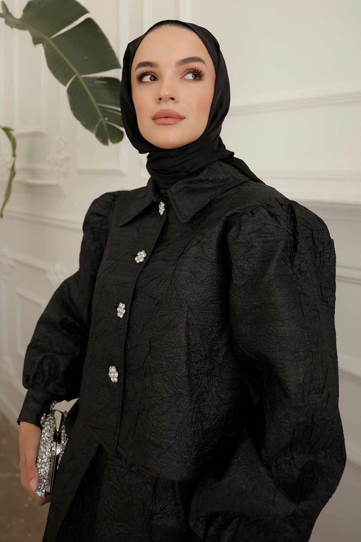 Taş Düğmeli Siyah Brokar Etekli Takım