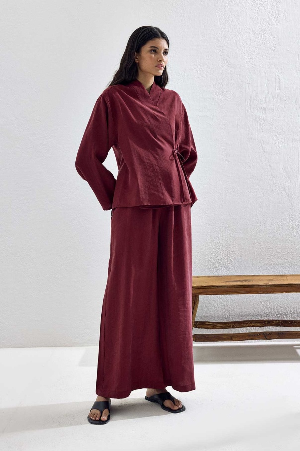 Bağcık Detaylı Lyocell Cupra Bordo Kimono Takım