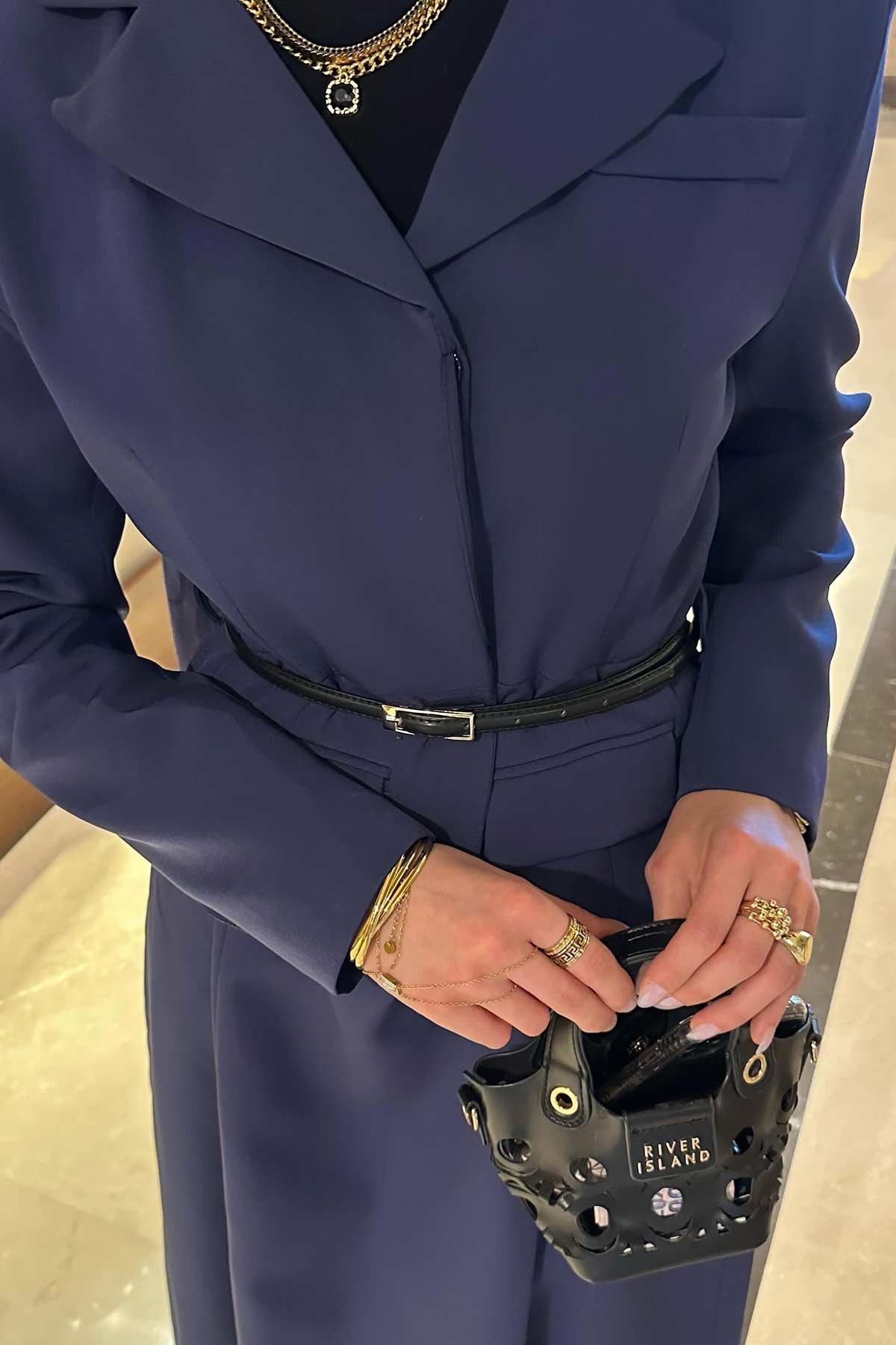 Premium Gold Kemer Detaylı Lacivert Ceket Elbise