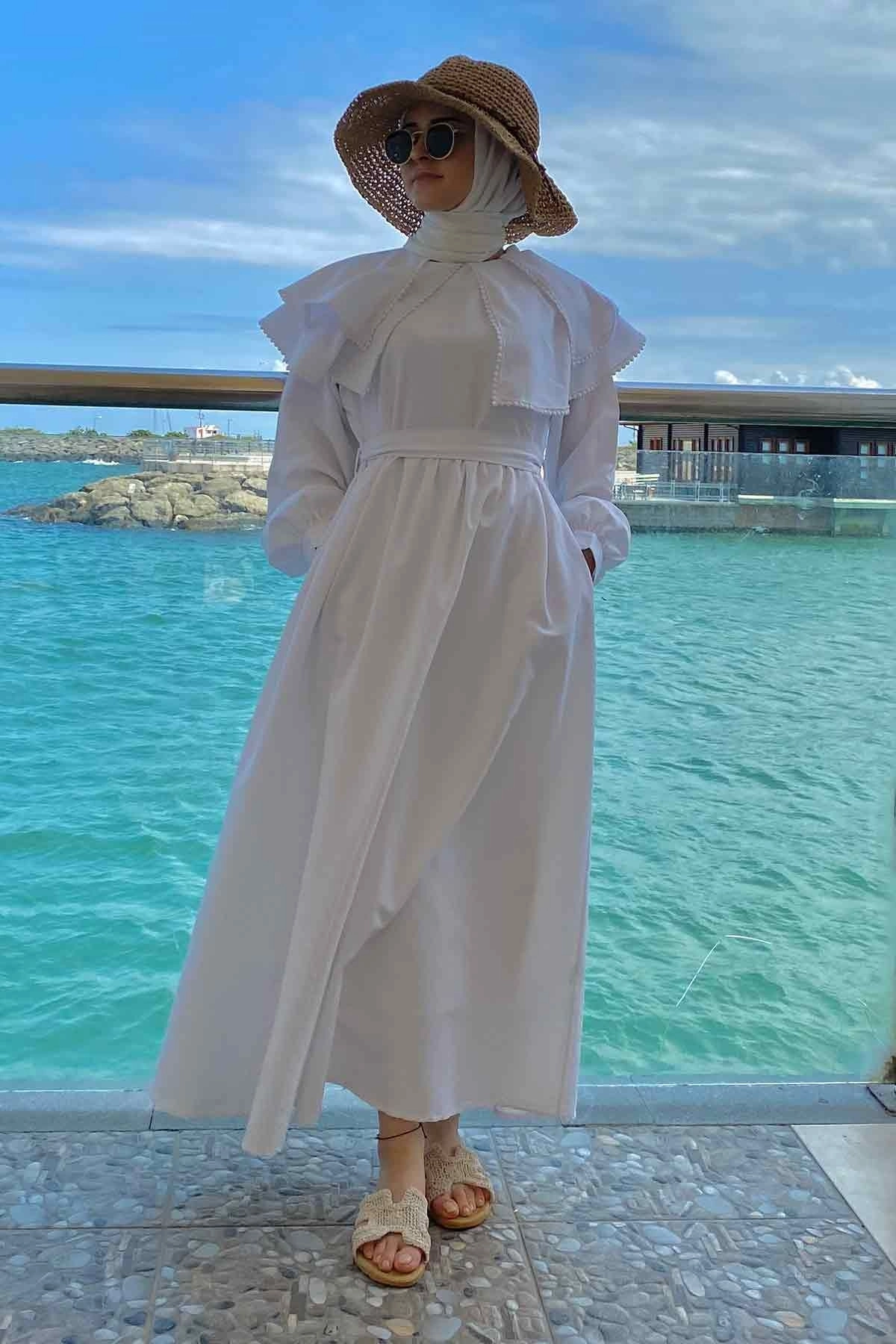Brode Şerit Detaylı Beyaz Elbise