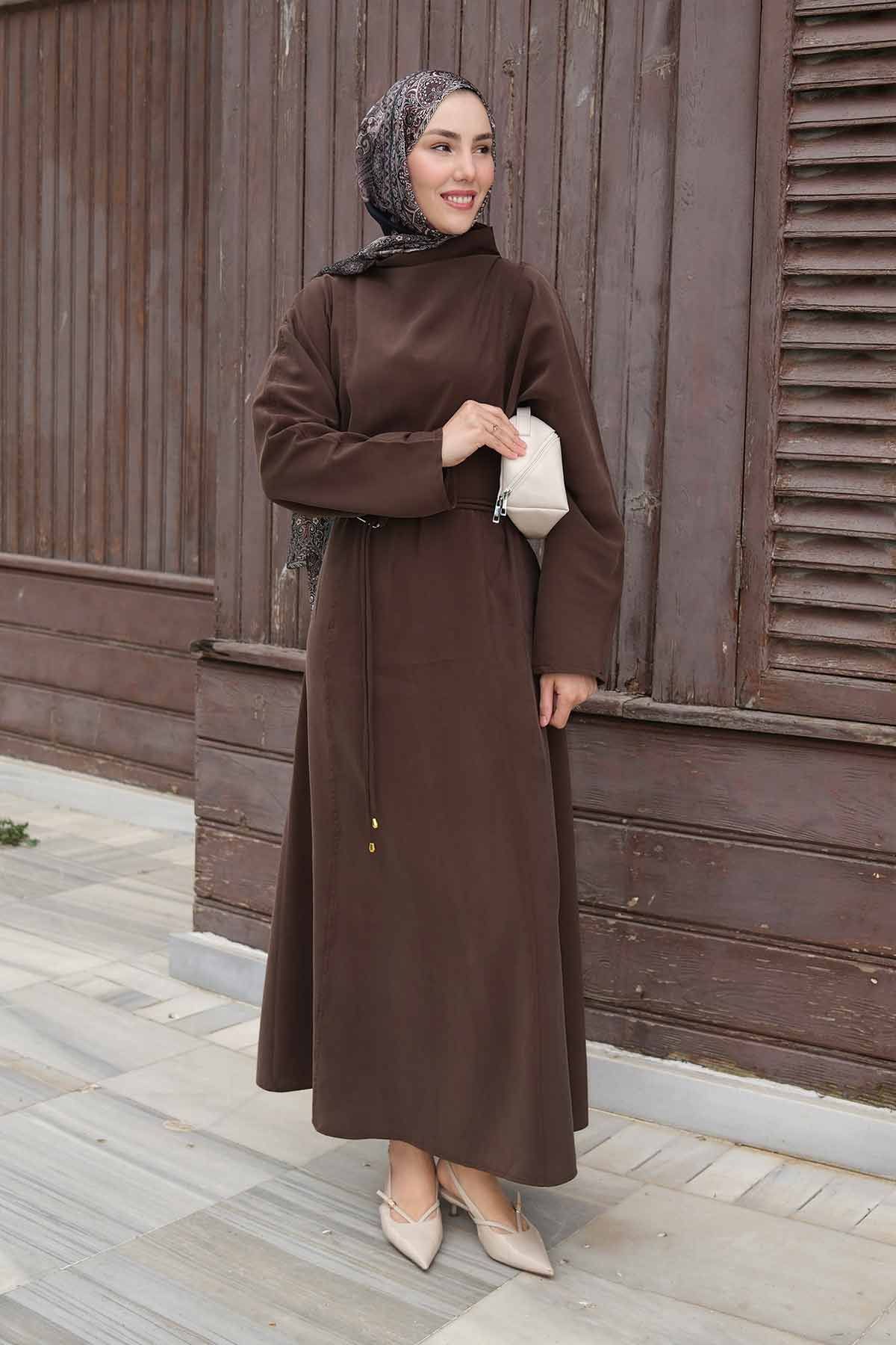 Gold Aksesuar Detaylı Uzun Kahve Elbise