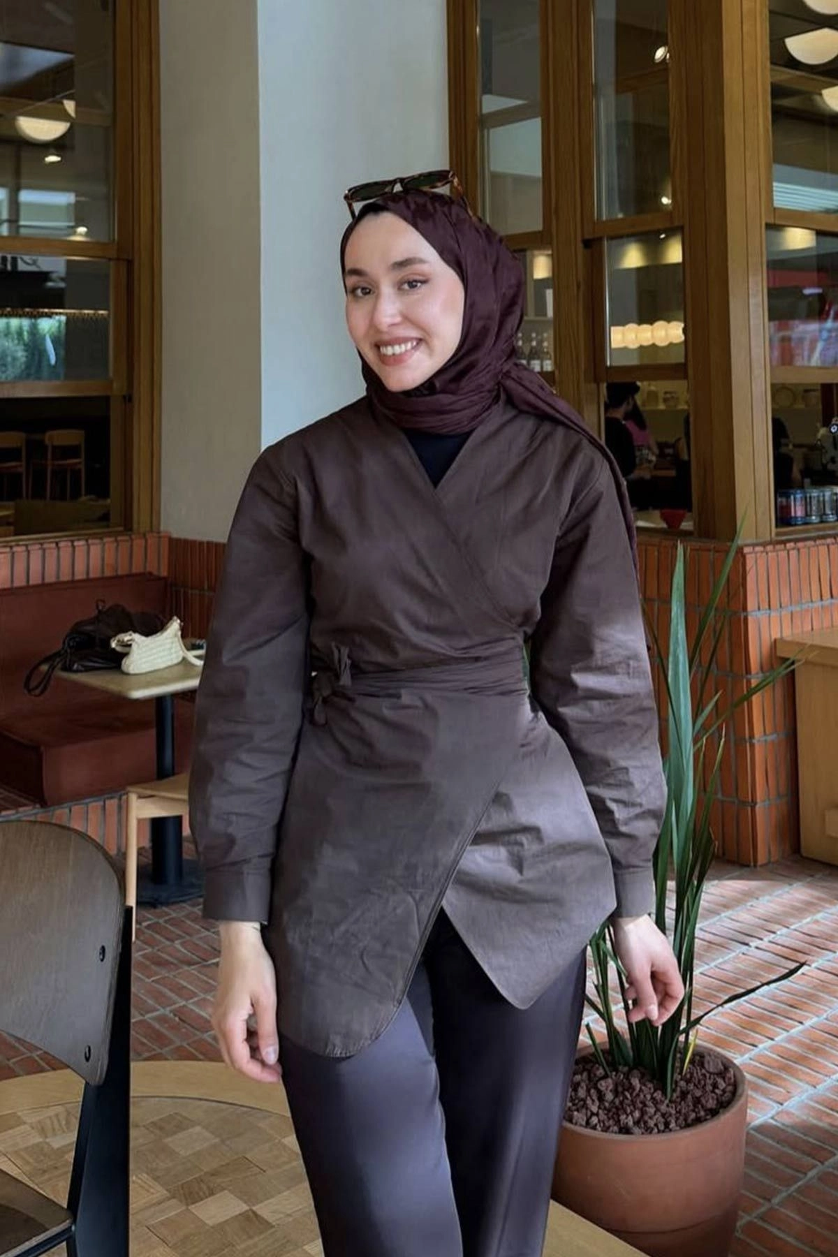 Dora Yandan Bağlama Detaylı Kahve Gömlek
