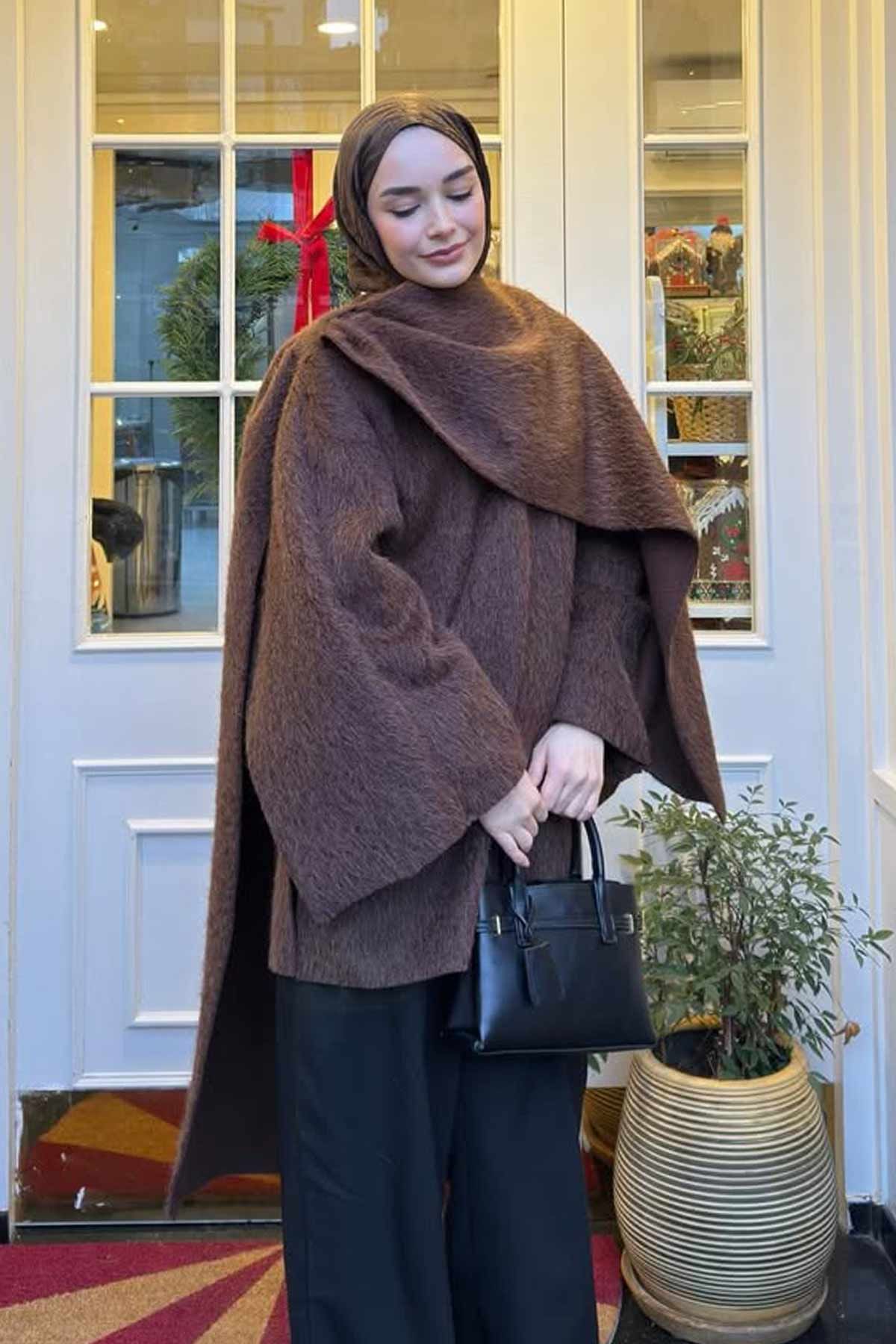 Asimetrik Kesim Pelerin Yaka Kahve Kaban
