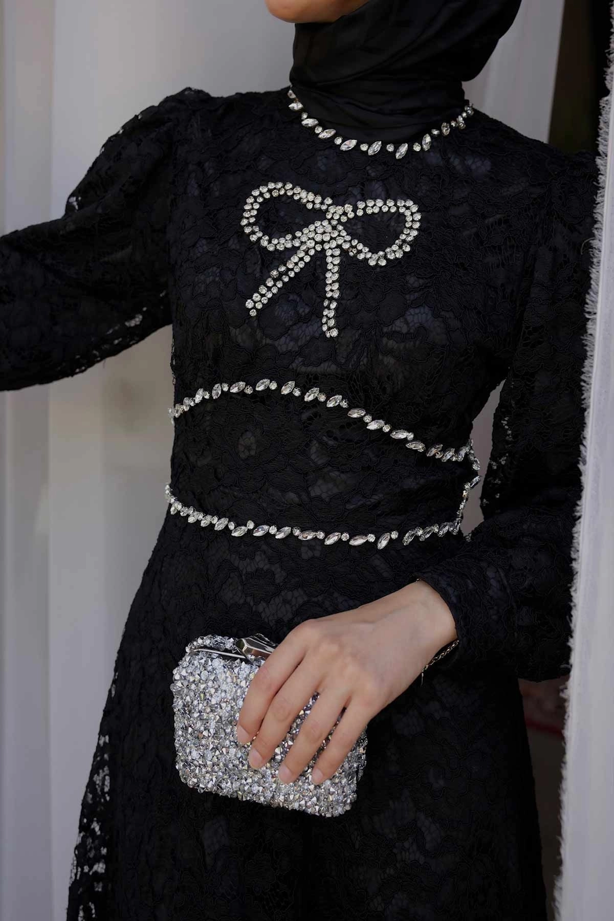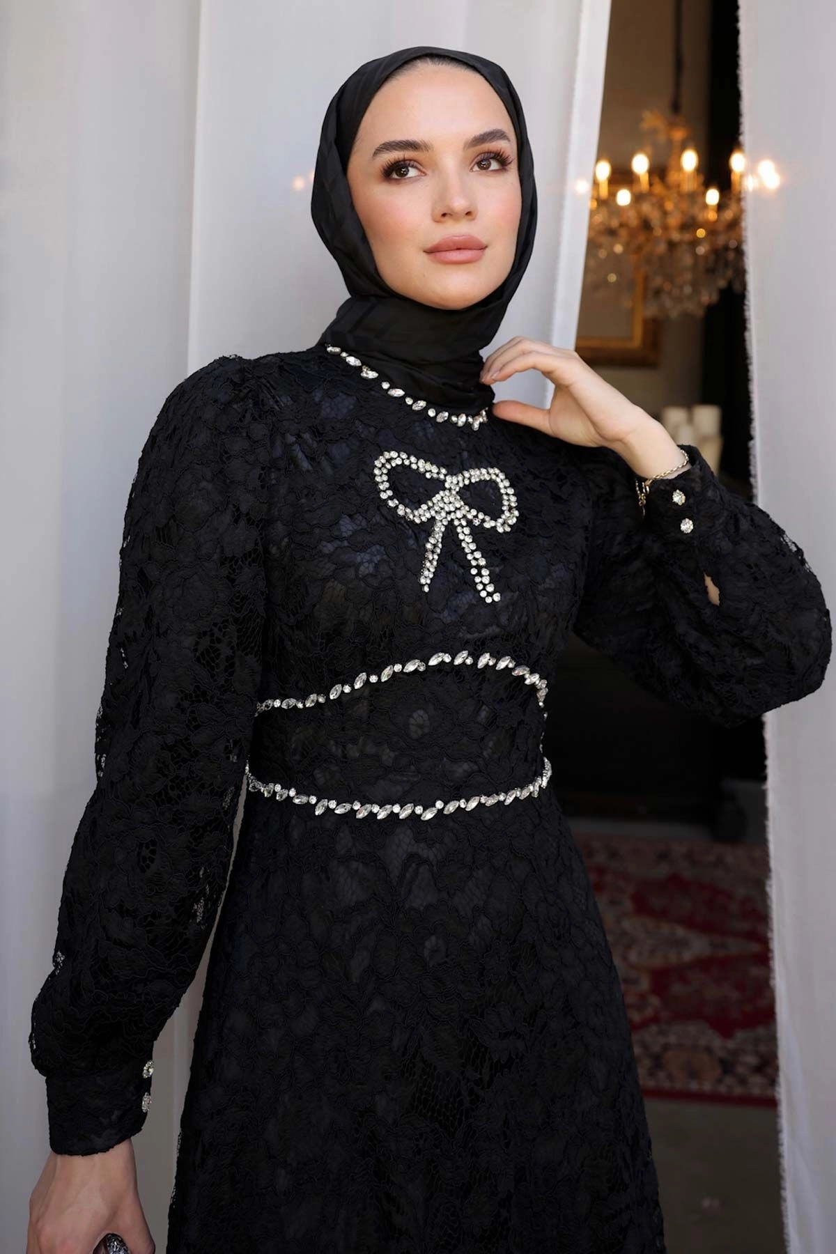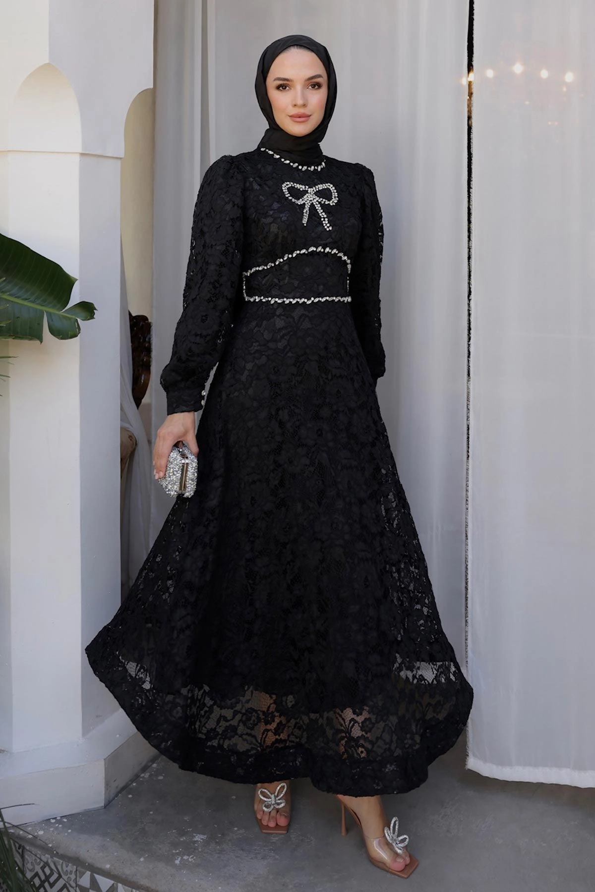 Elisabeth Taş İşlemeli Dantel Siyah Elbise
