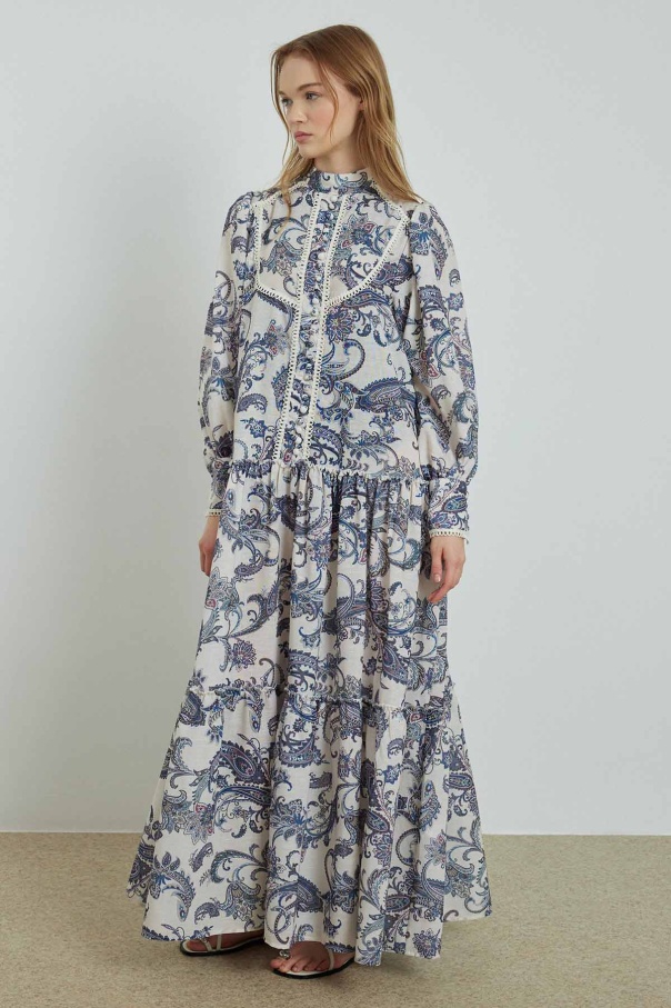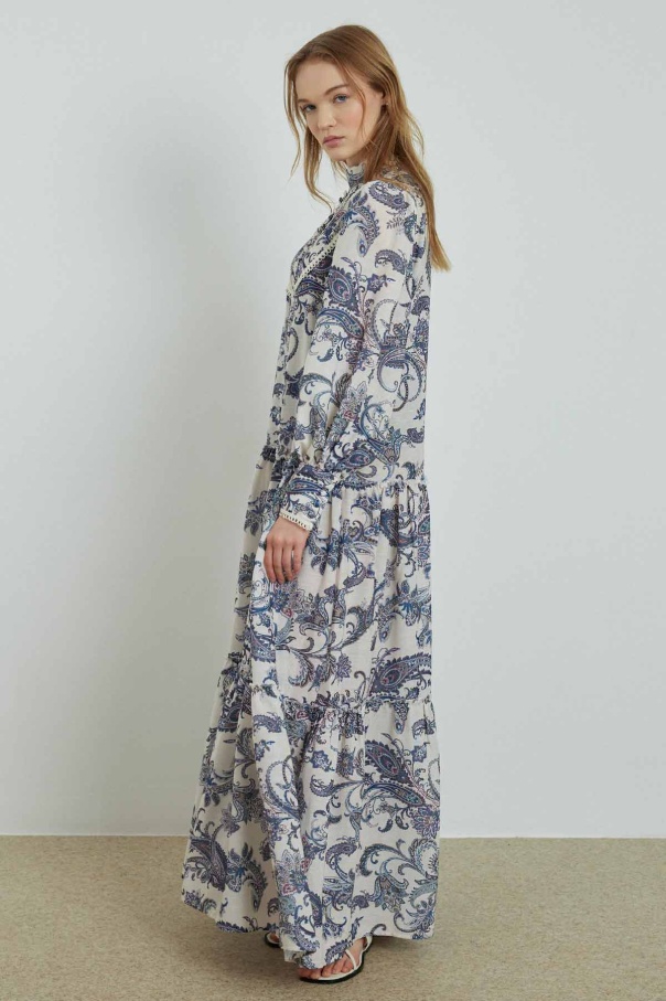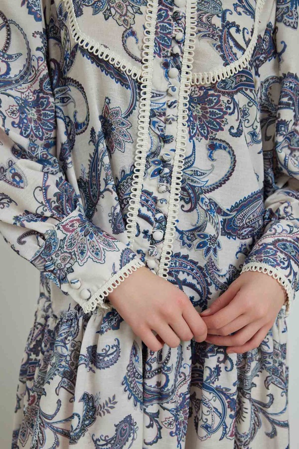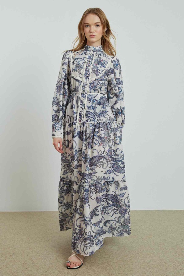 Etnik Desenli Keten Mavi Elbise