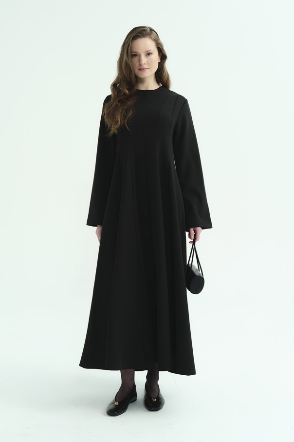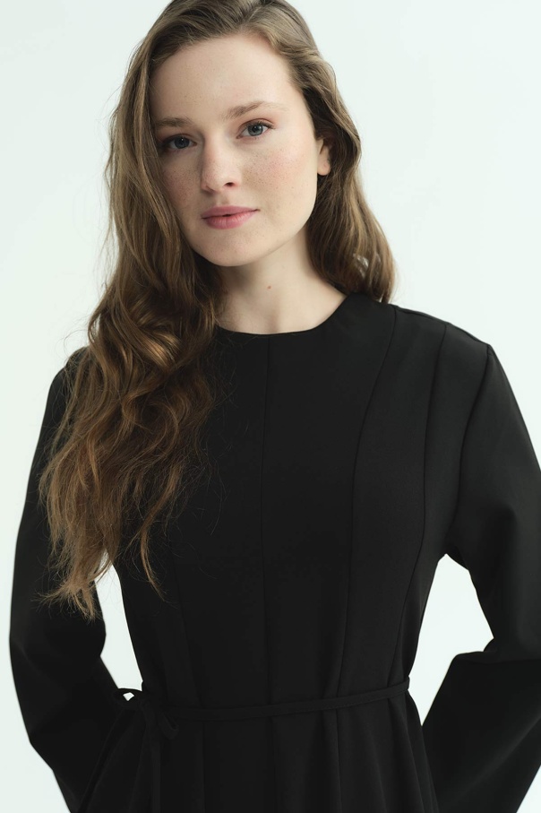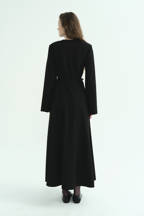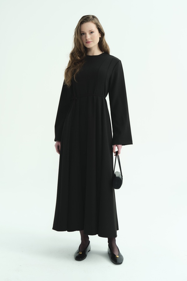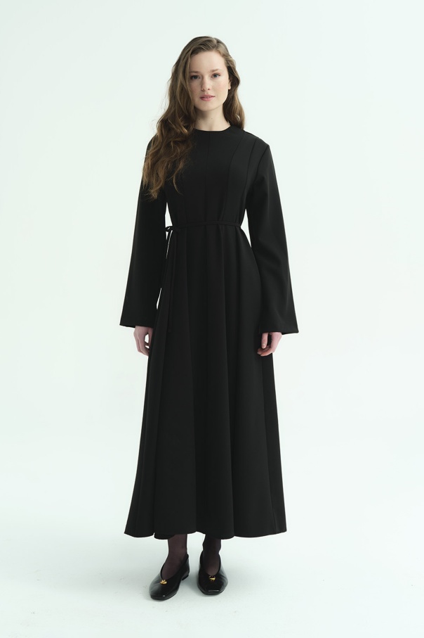 Evaze Kesim Belden Oturma Detaylı Siyah Elbise