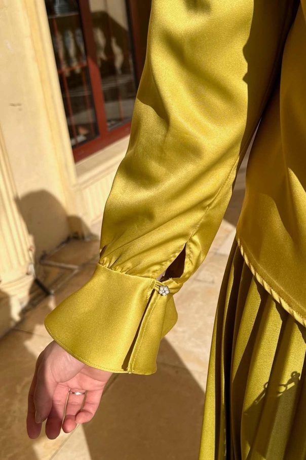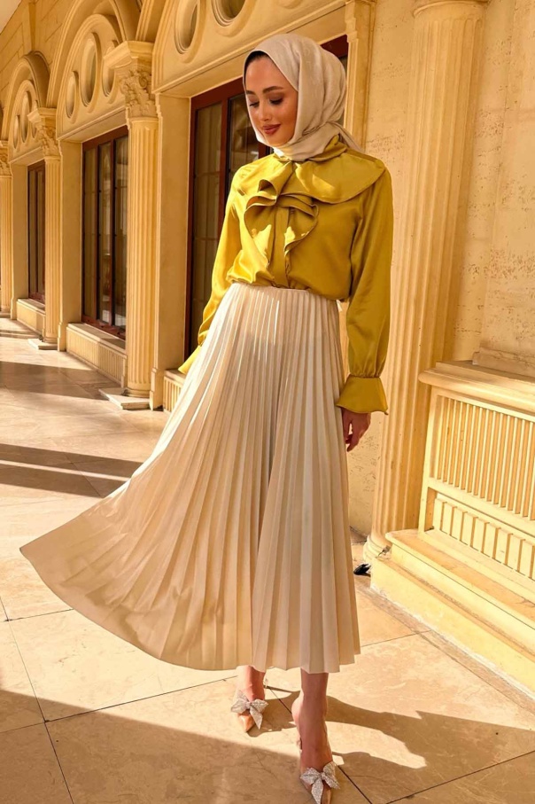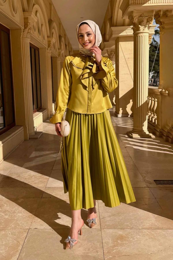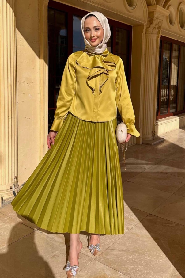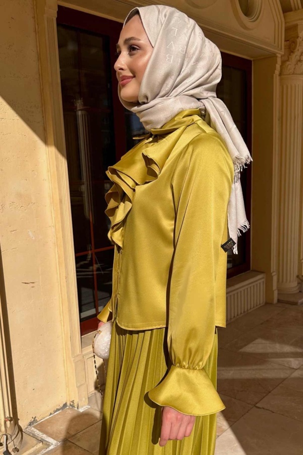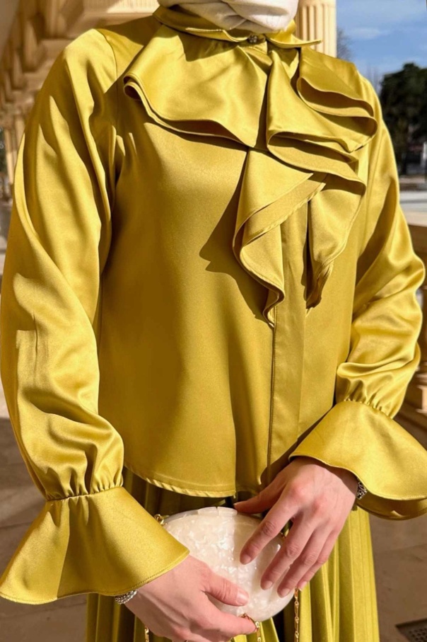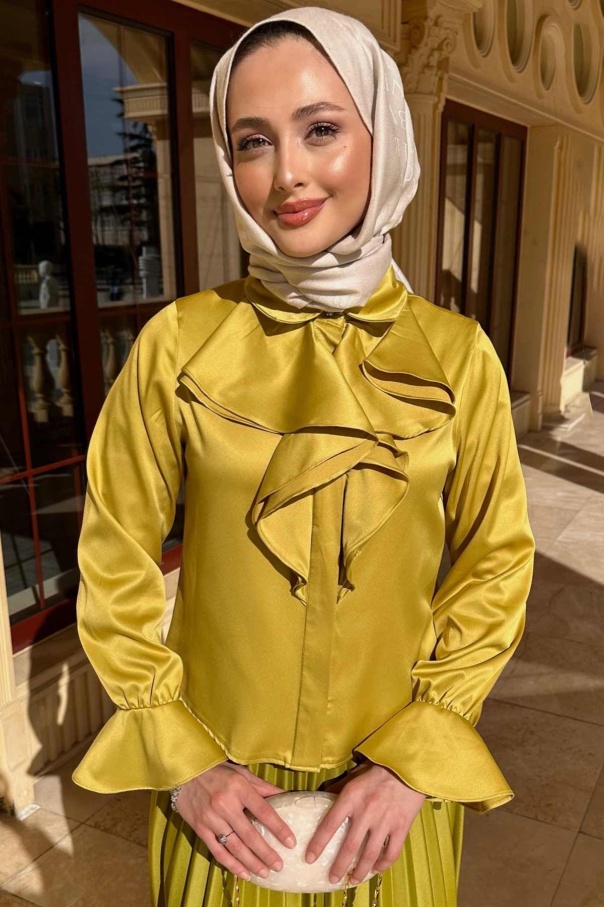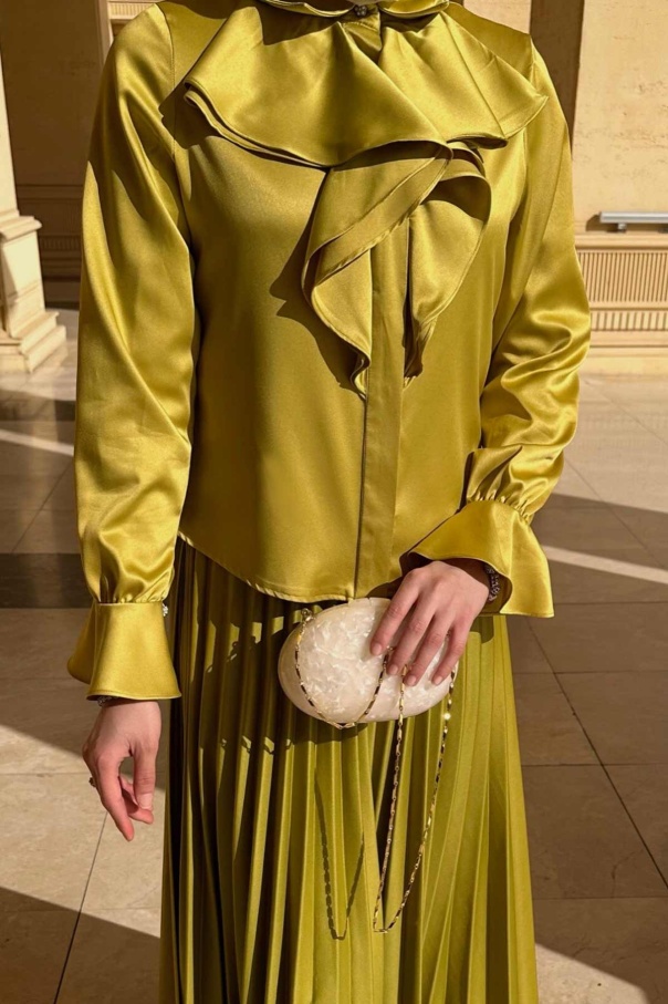 Fırfırlı Saten Yağ Yeşili Gömlek