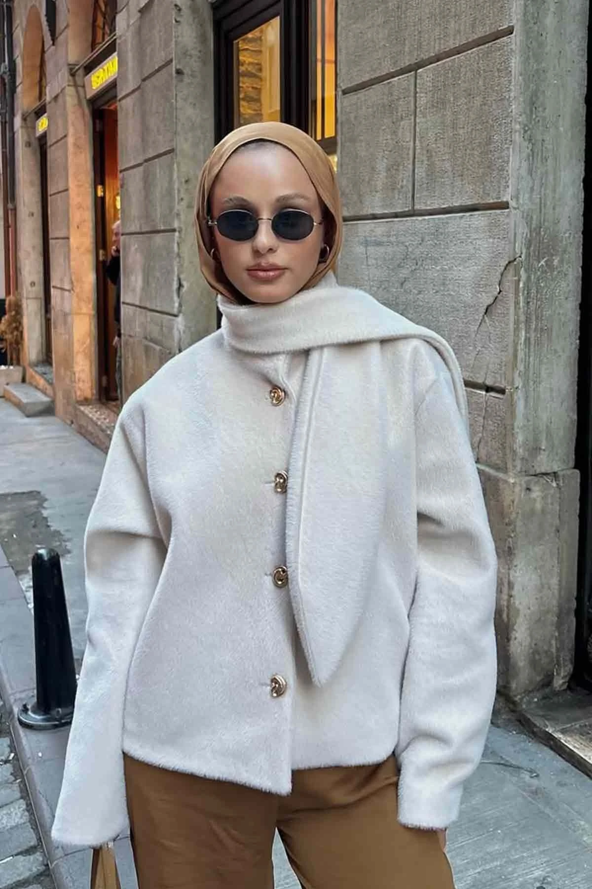 Fular Bağlama Detaylı Kısa Taş Ceket
