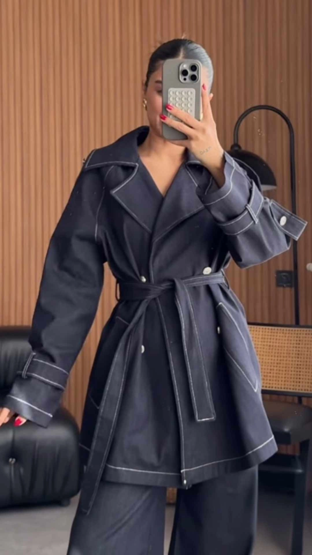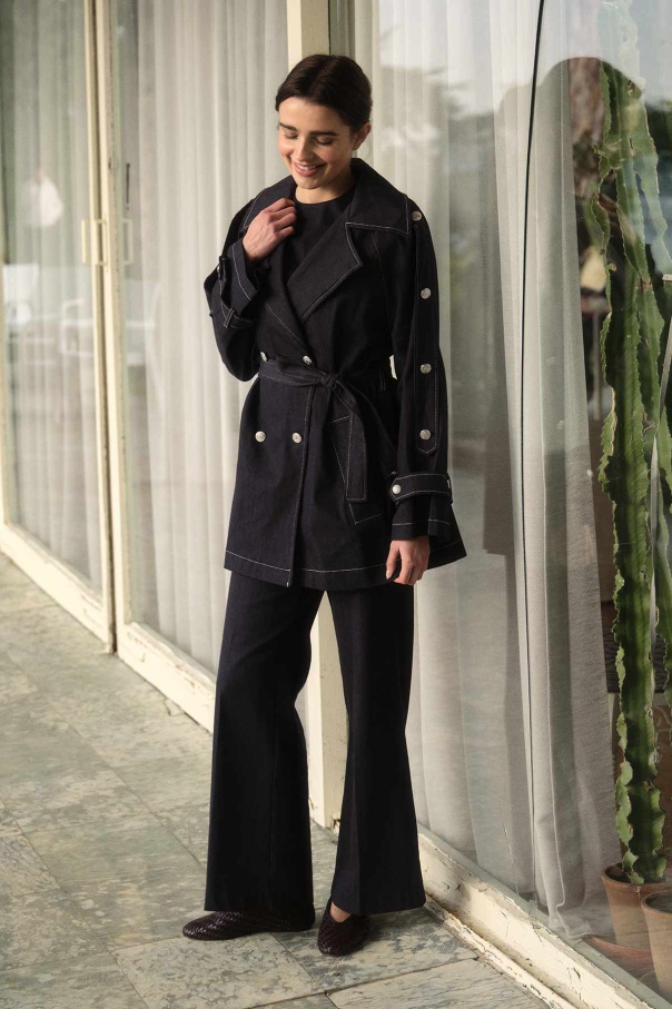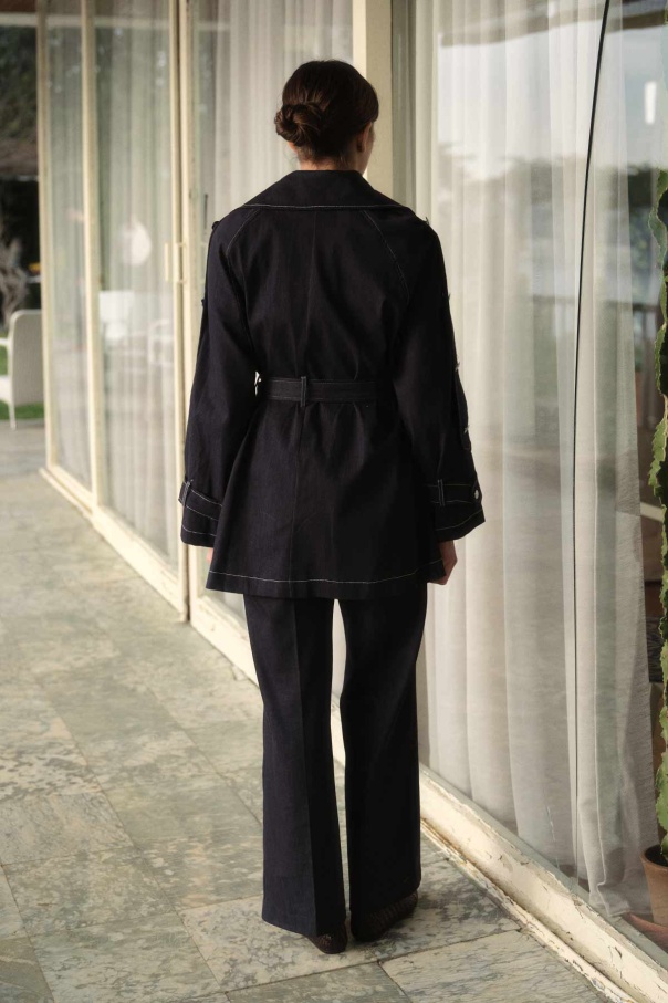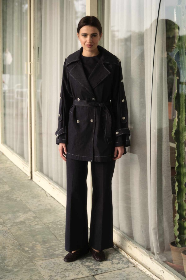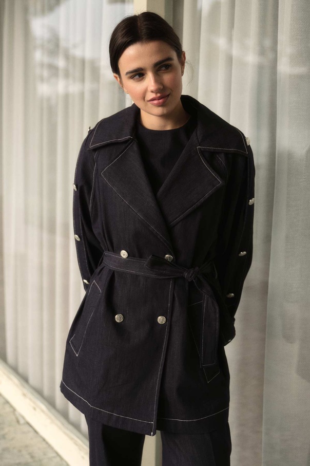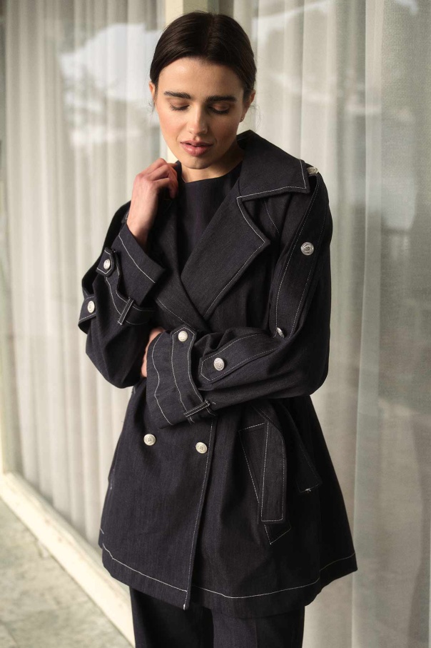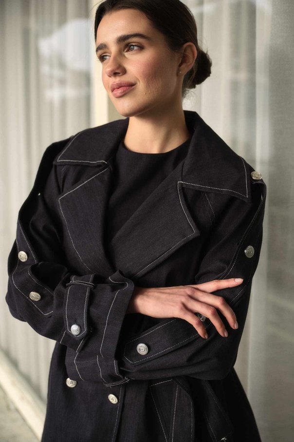 Geniş Yaka Çift İğne Dikişli Denim Kısa Lacivert Trençkot