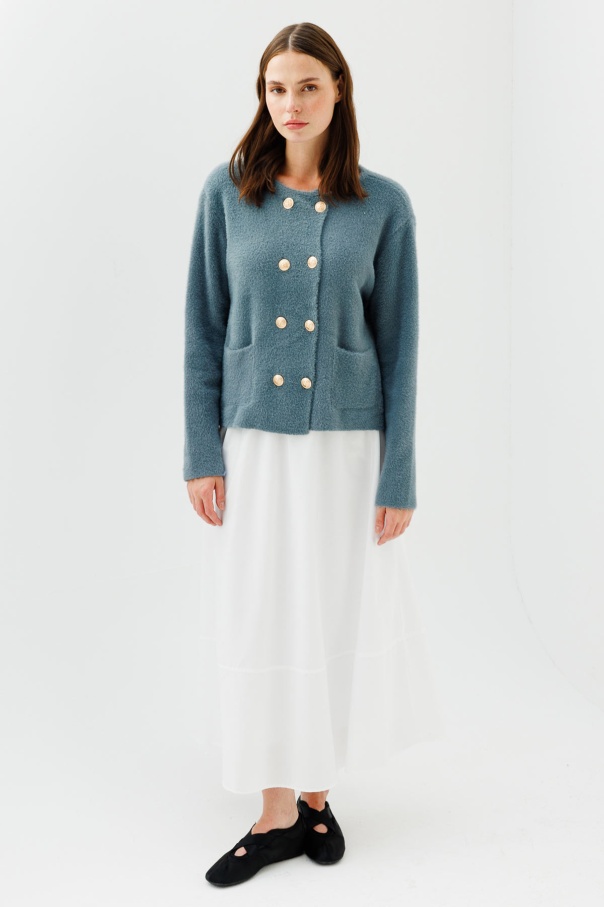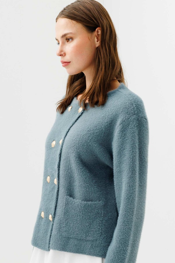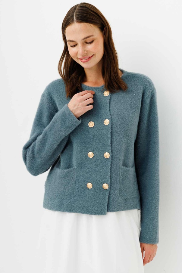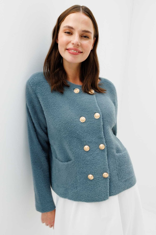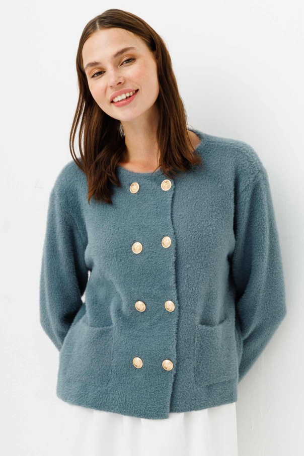 Gold Düğme Detaylı Tüylü Çağla Hırka