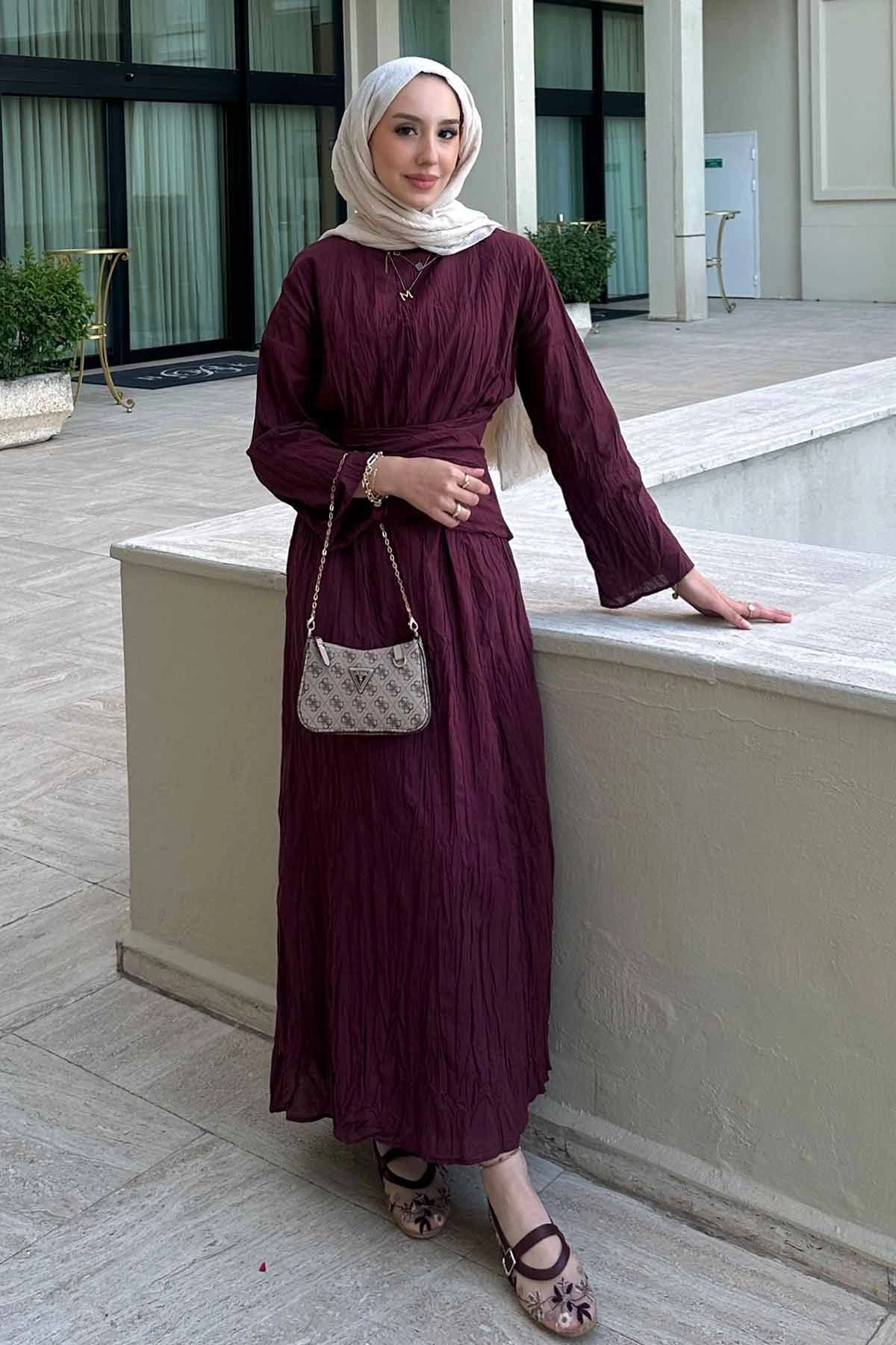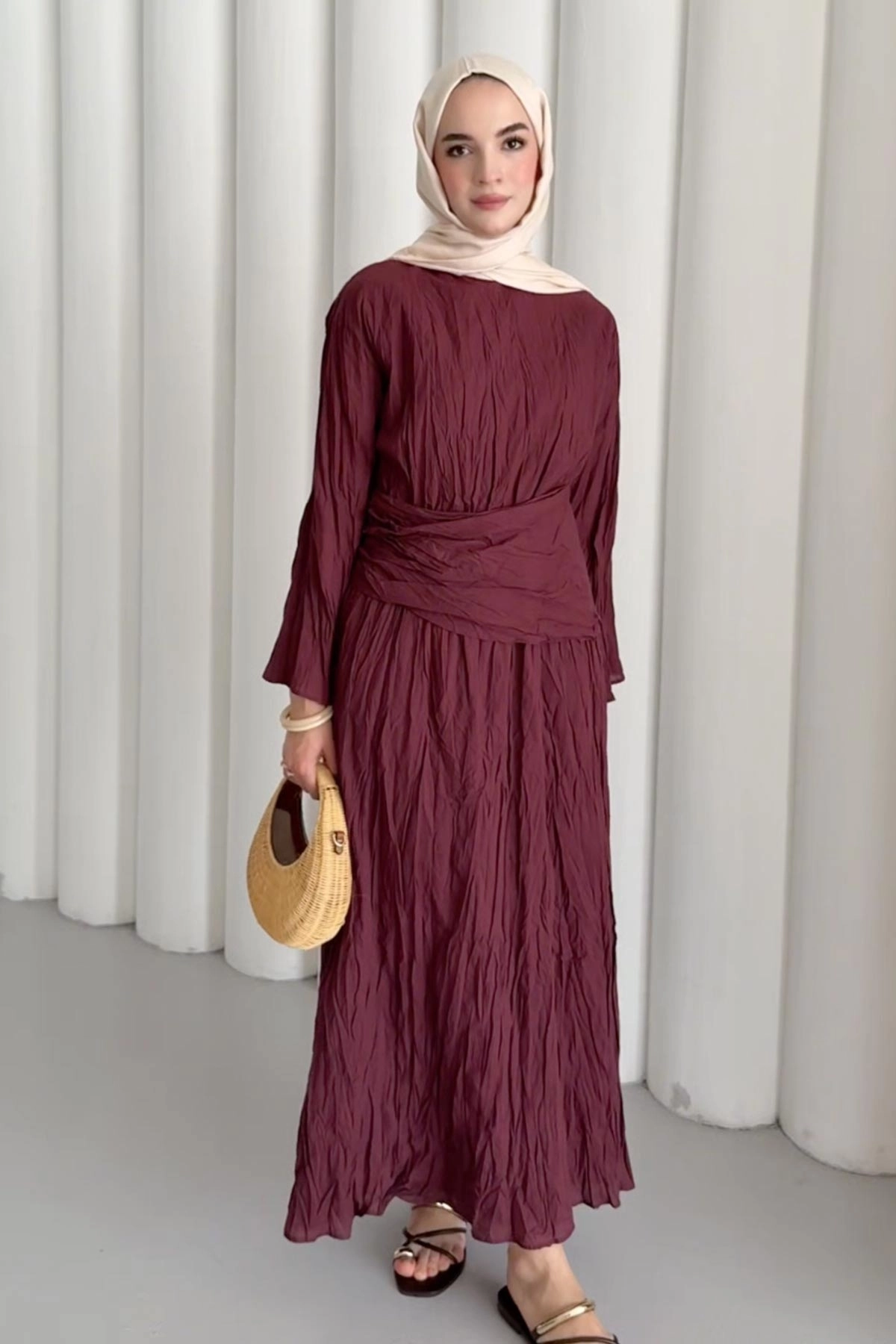 Kırışık Görünümlü Pamuklu Vual Bordo Elbise