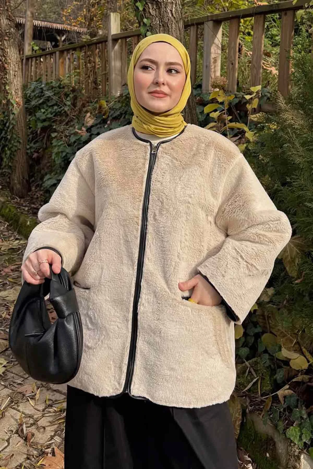 Kontrast Deri Biyeli Pelüş Taş Mont