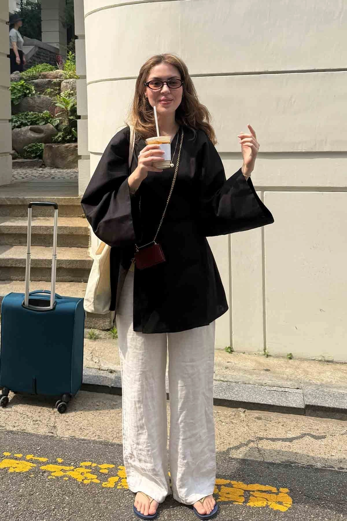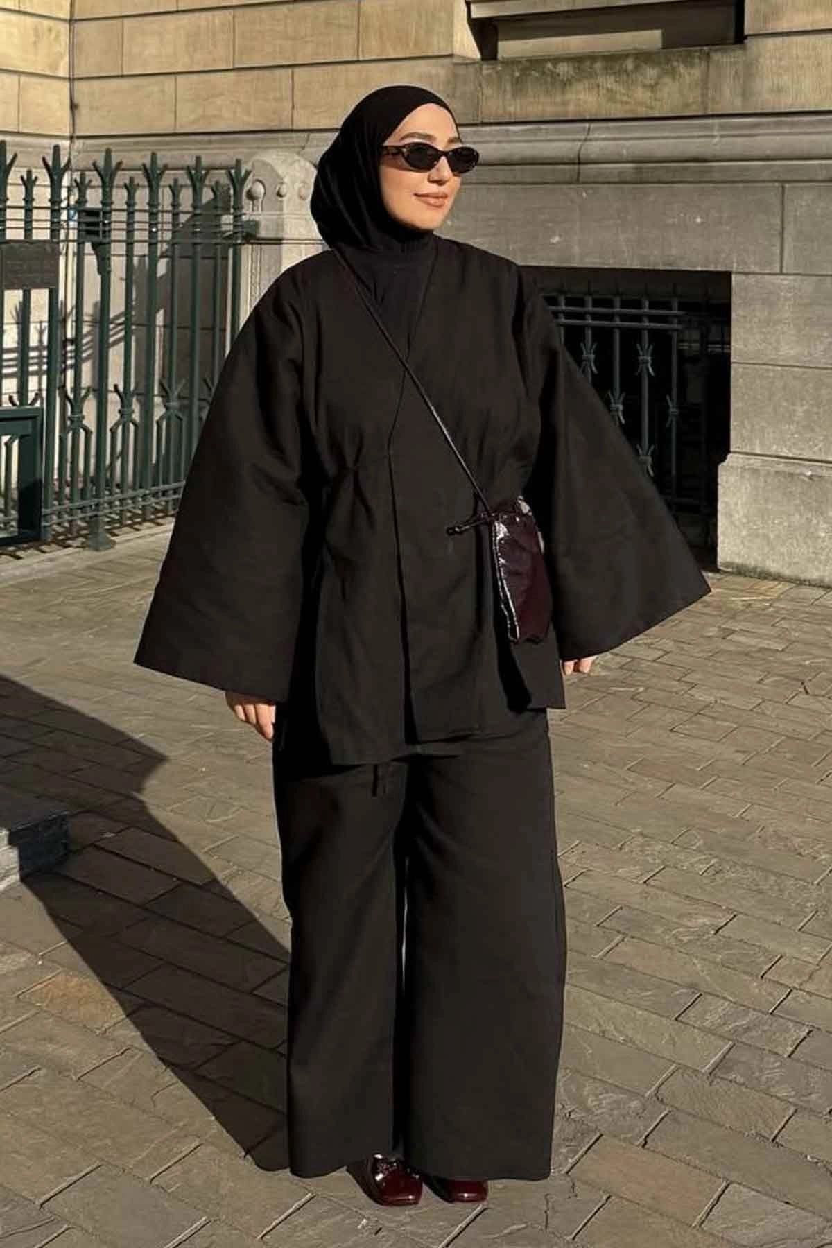 Lyocell Keten Bağcık Detaylı Siyah Kimono