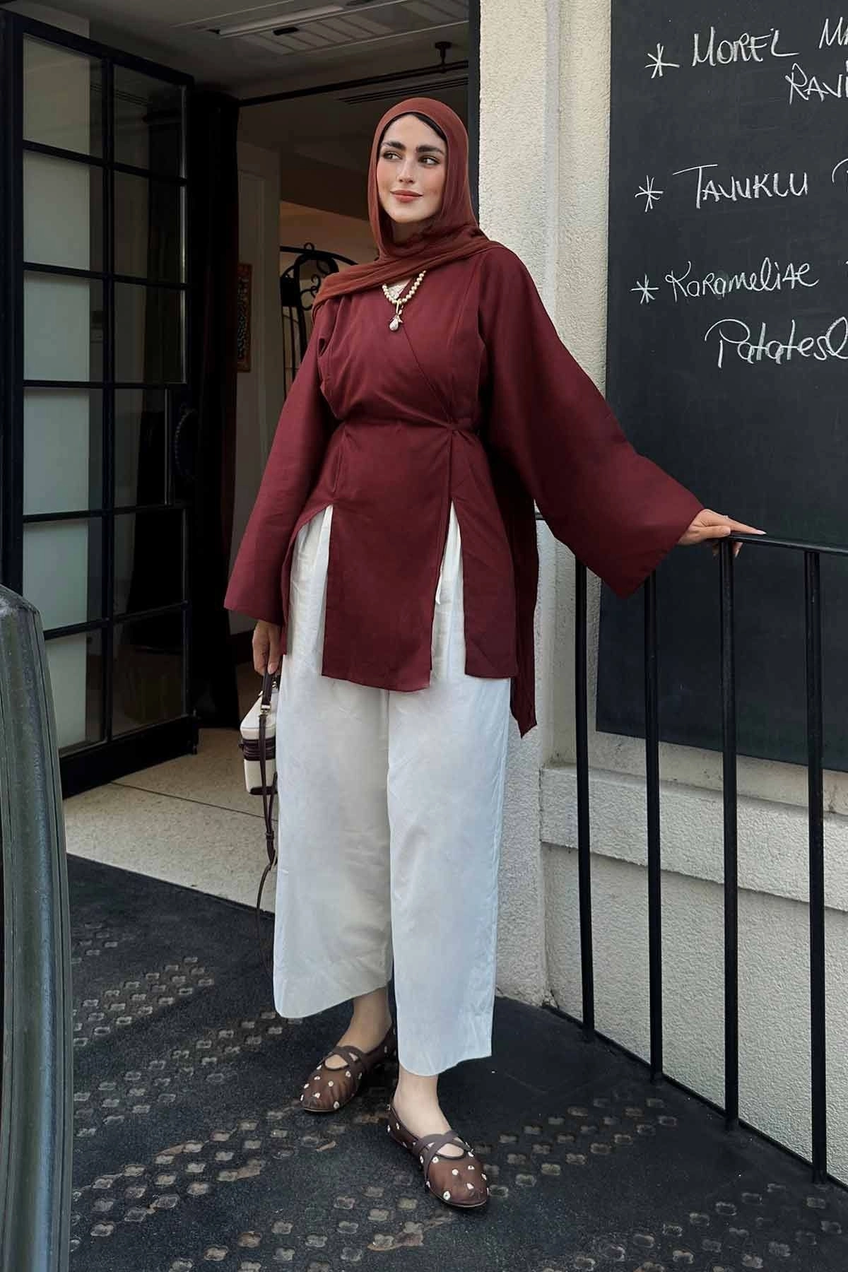 Lyocell Keten Dökümlü Lastikli Ekru Pantolon
