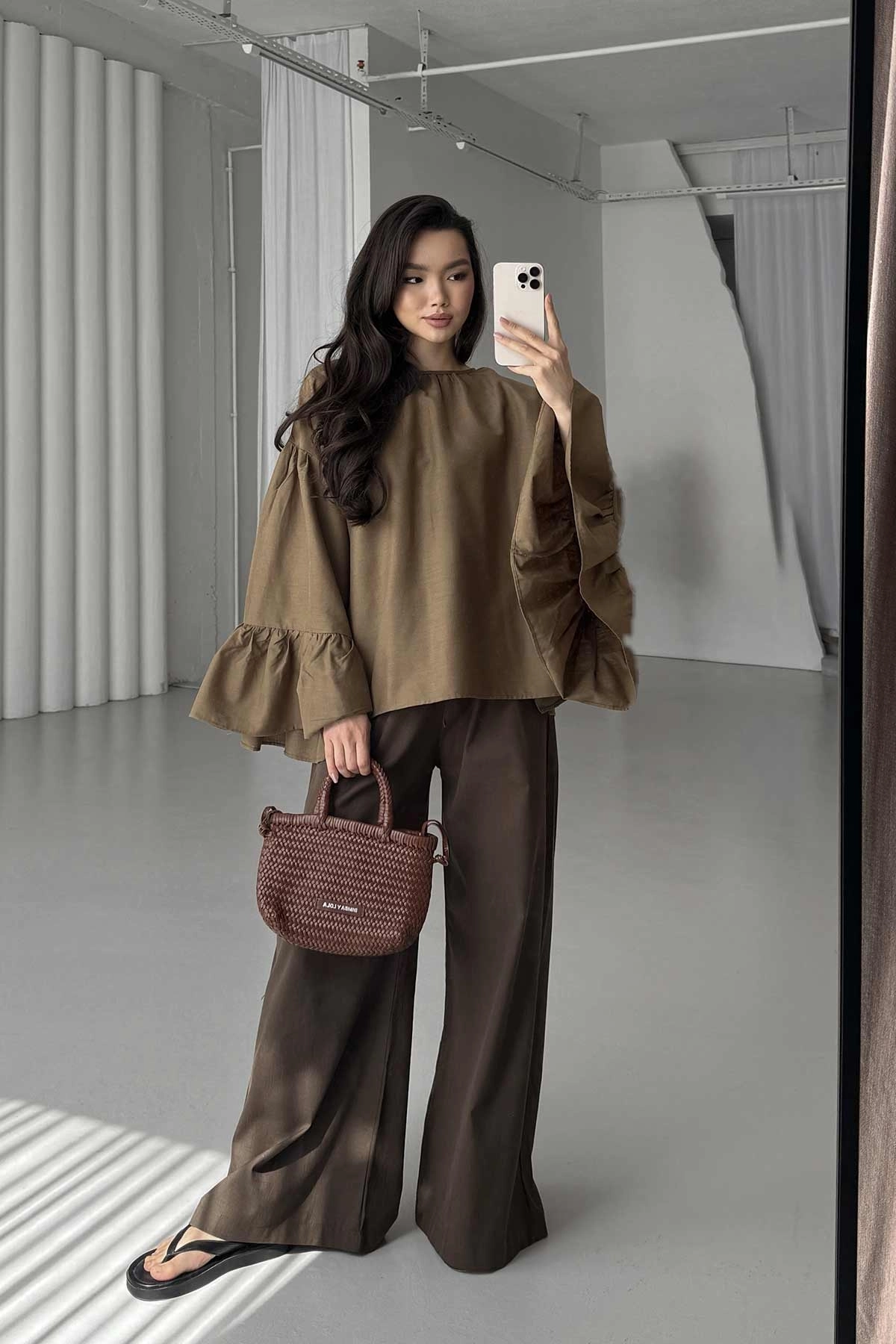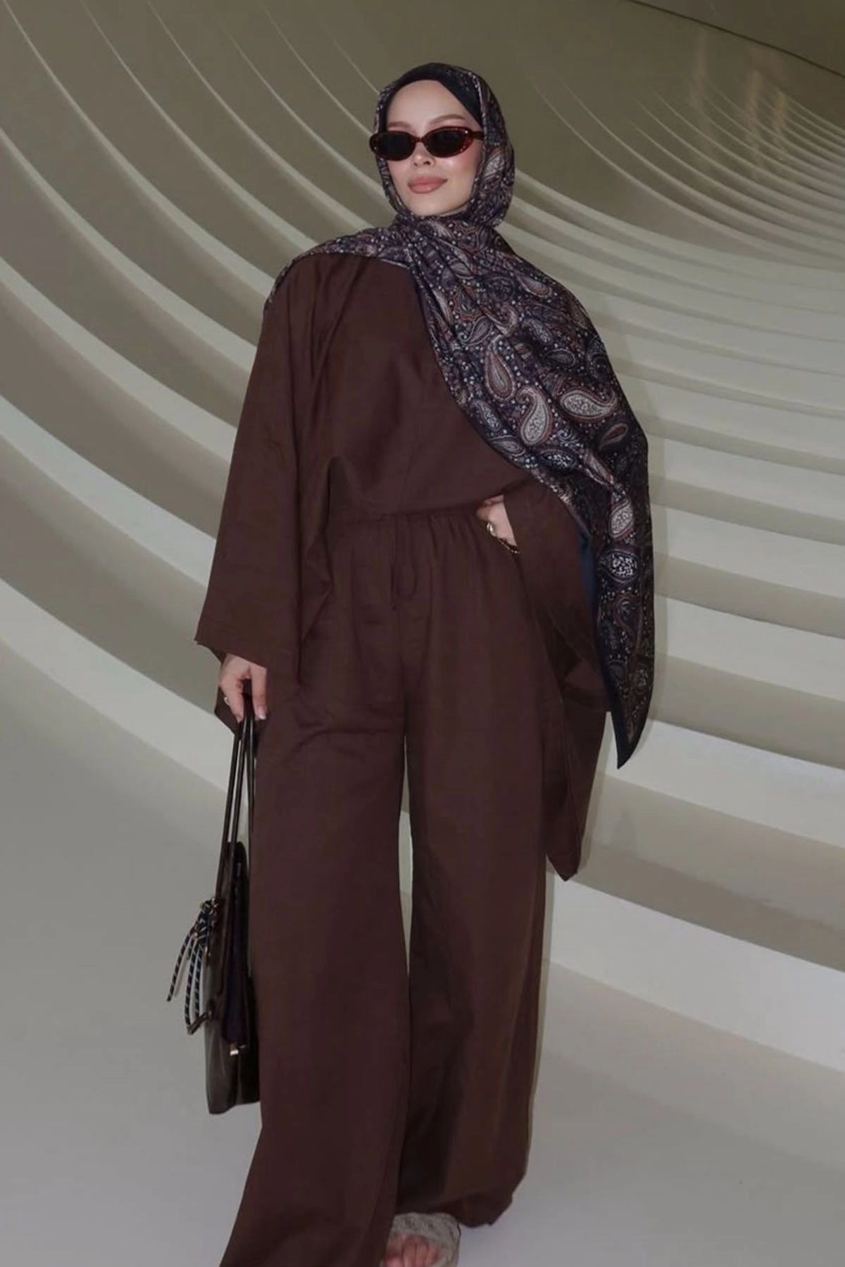 Lyocell Keten Dökümlü Lastikli Kül Kahve Pantolon