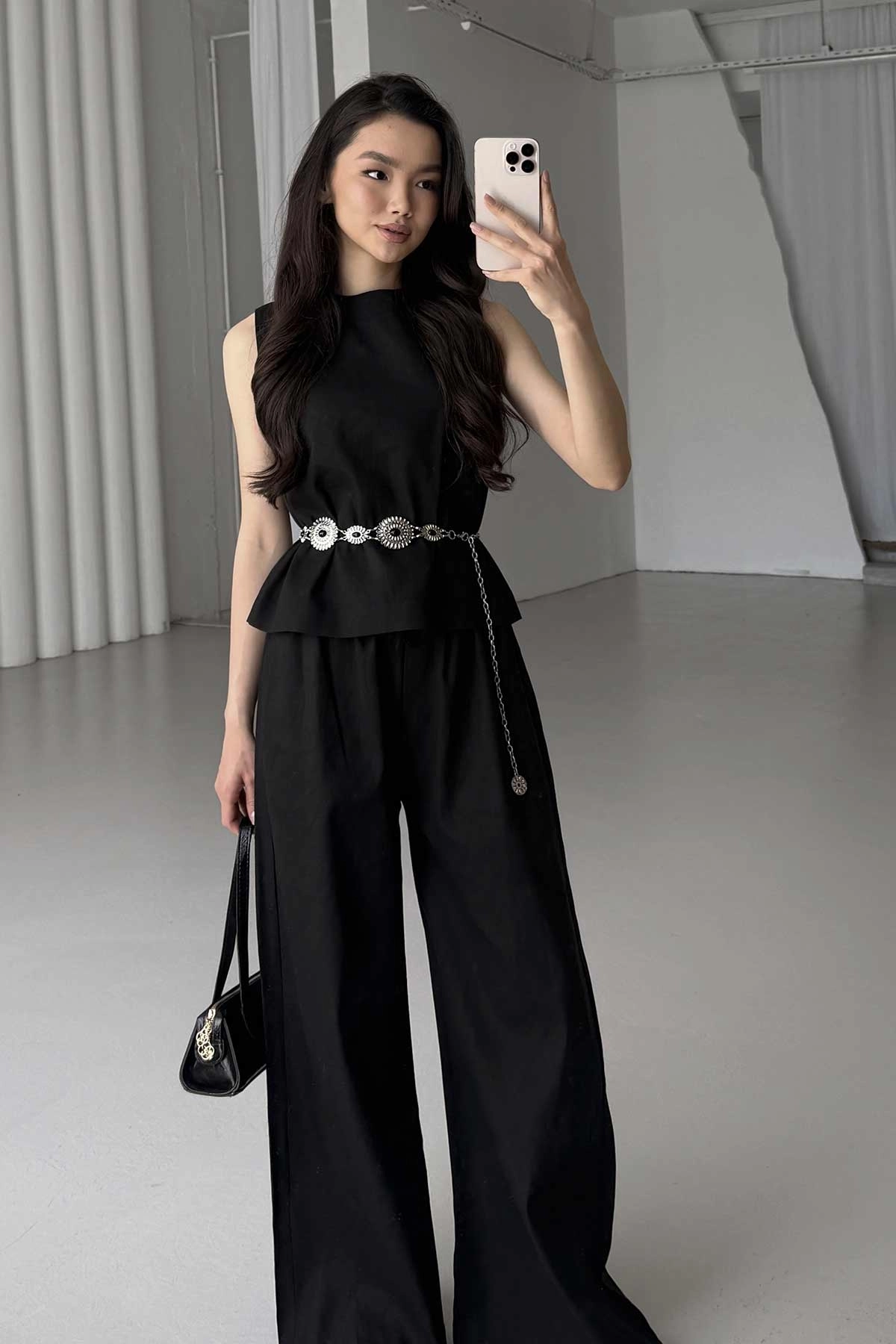 Lyocell Keten Kolsuz Siyah Bluz