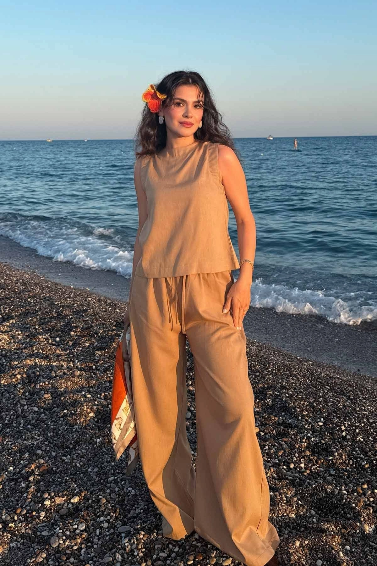 Lyocell Keten Kolsuz Sütlü Kahve Bluz