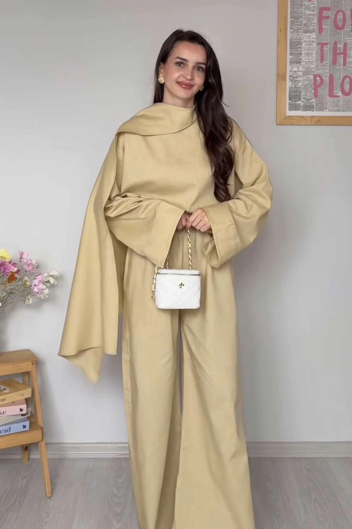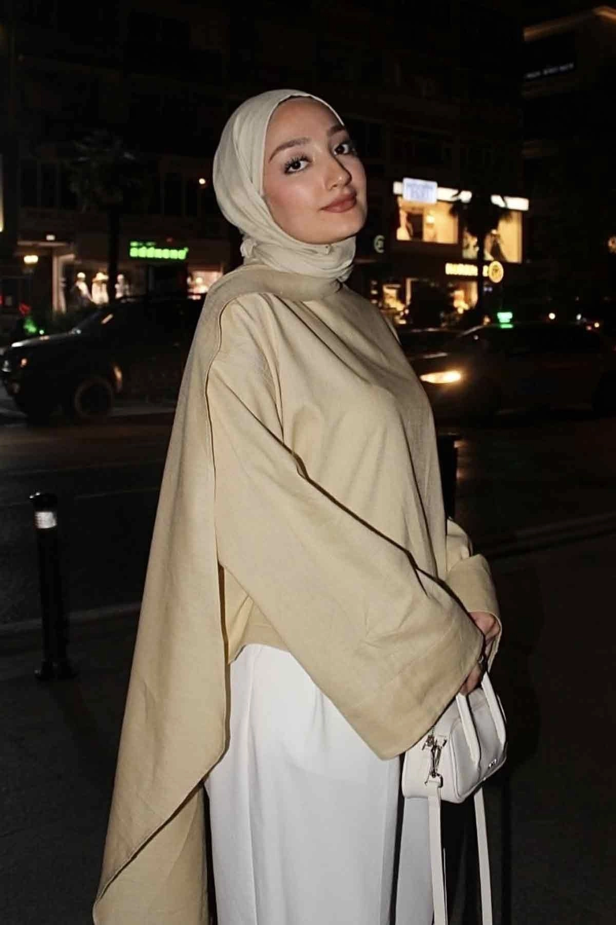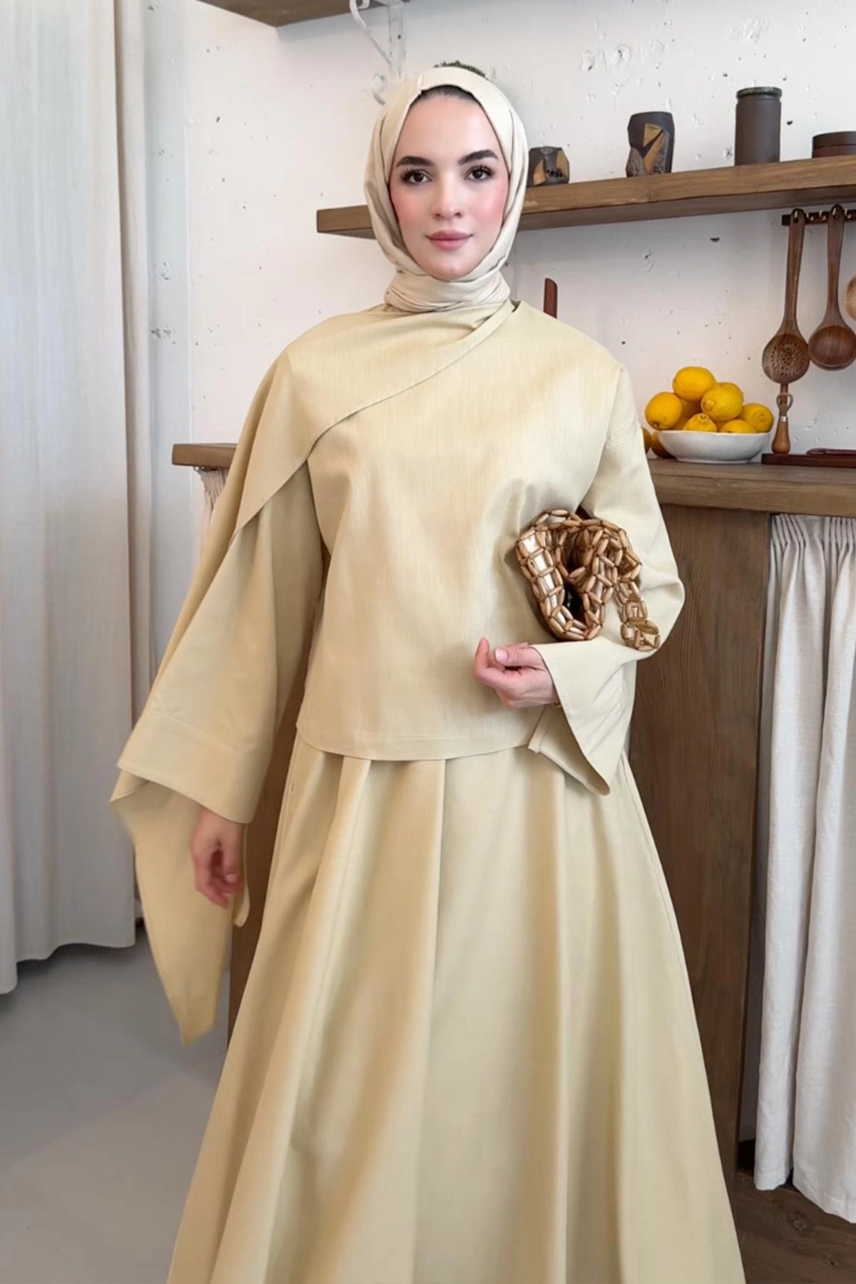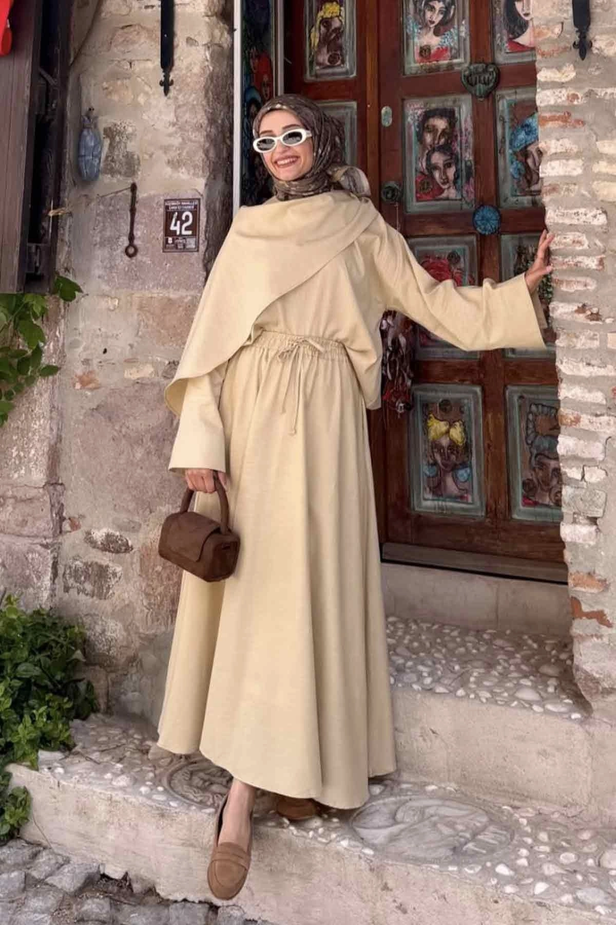 Lyocell Keten Pelerin Detaylı Basic Kum Beji Bluz