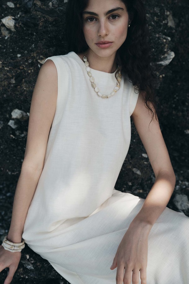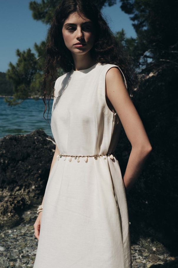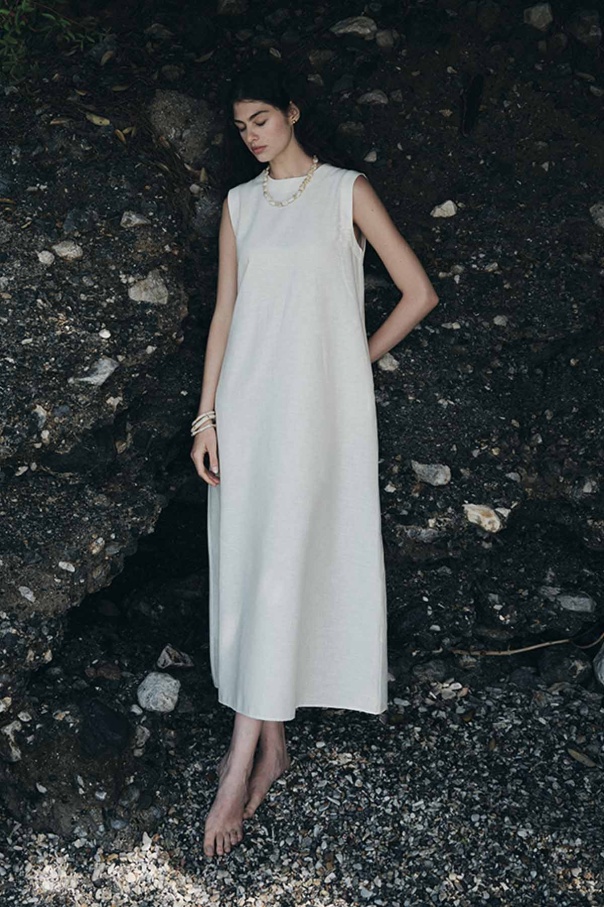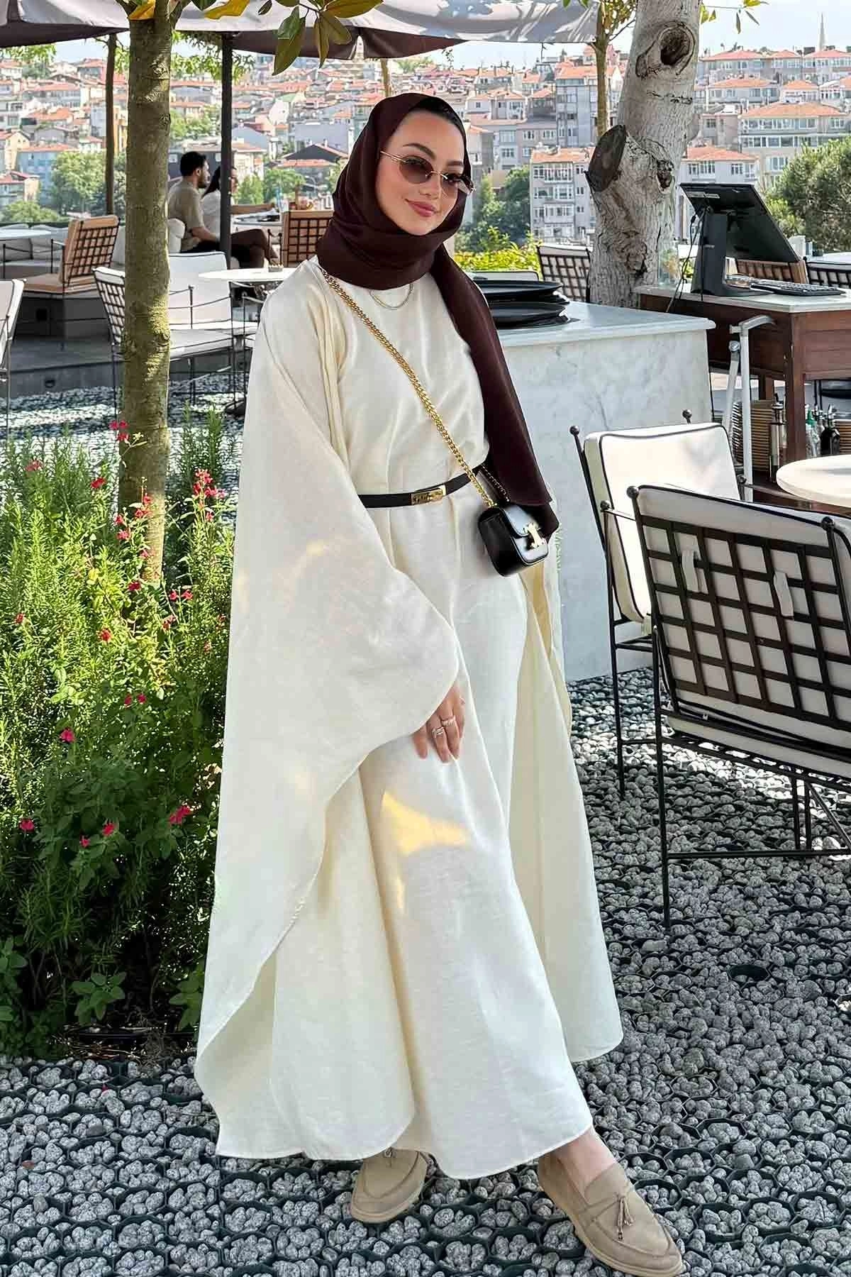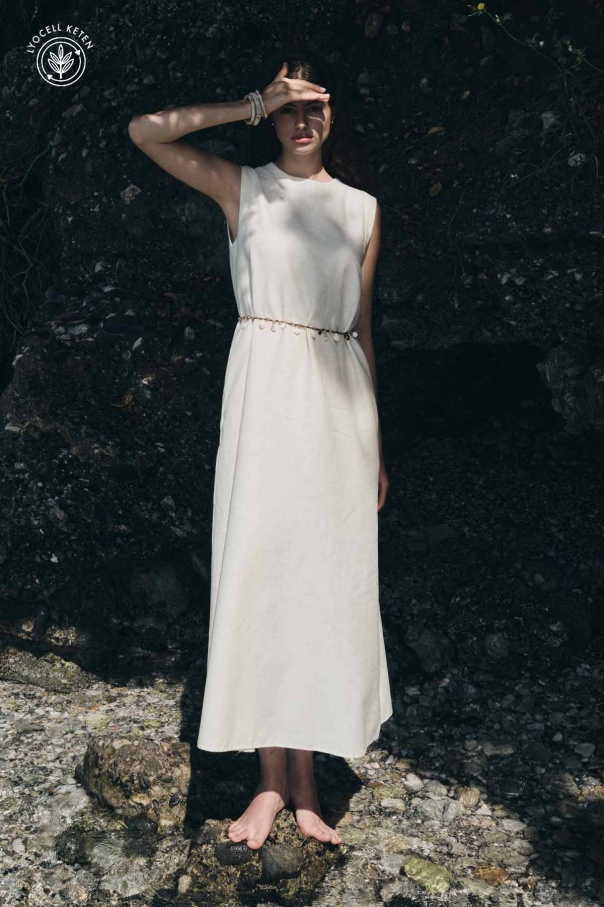 Lyocell Keten Sıfır Kol Ekru Elbise