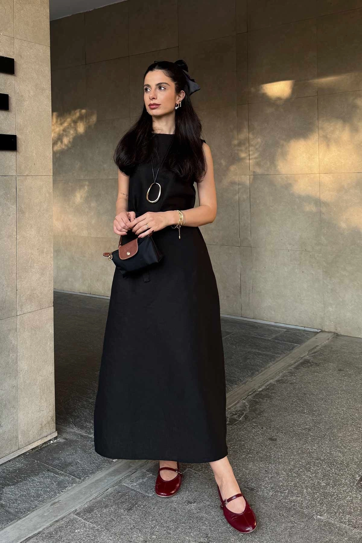 Lyocell Keten Sıfır Kol Siyah Elbise