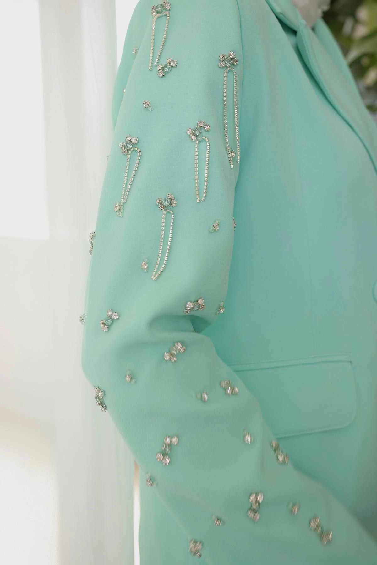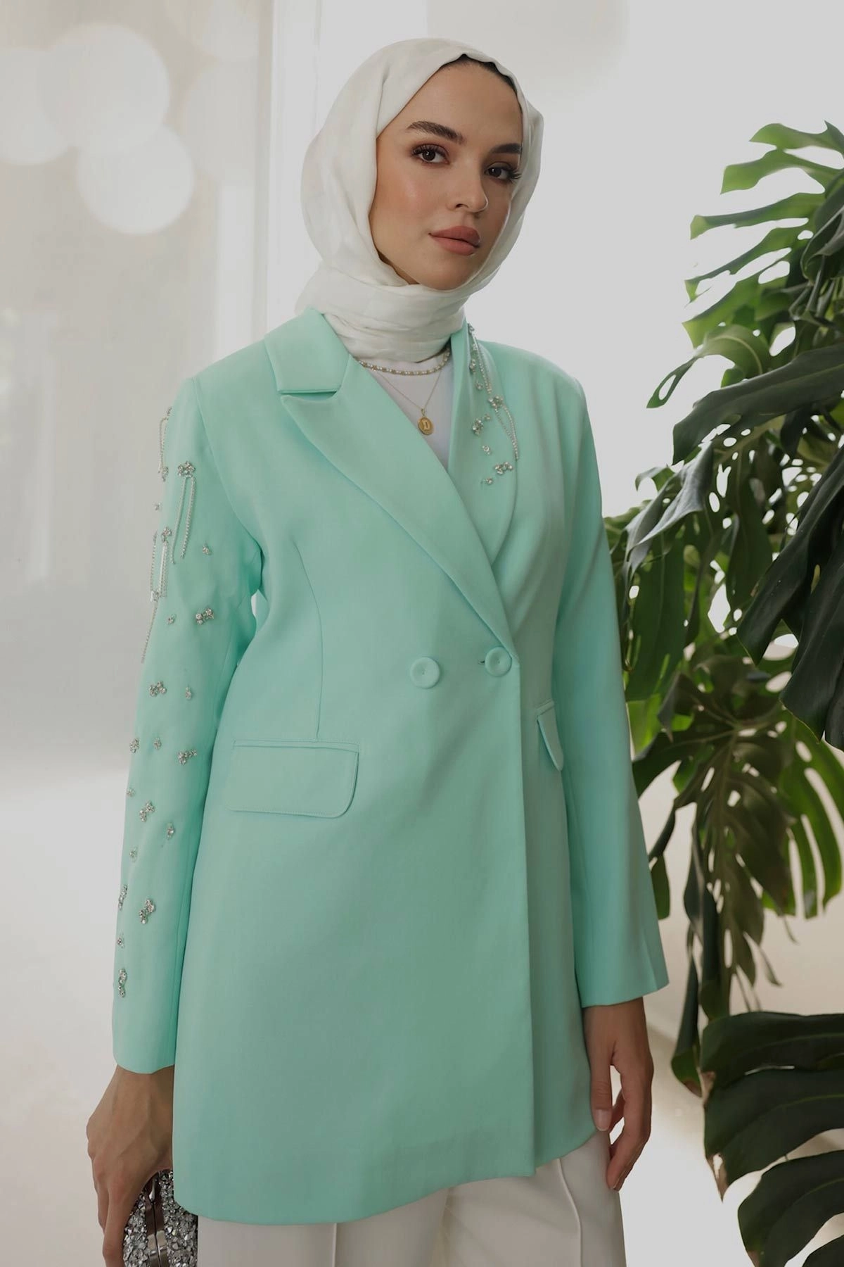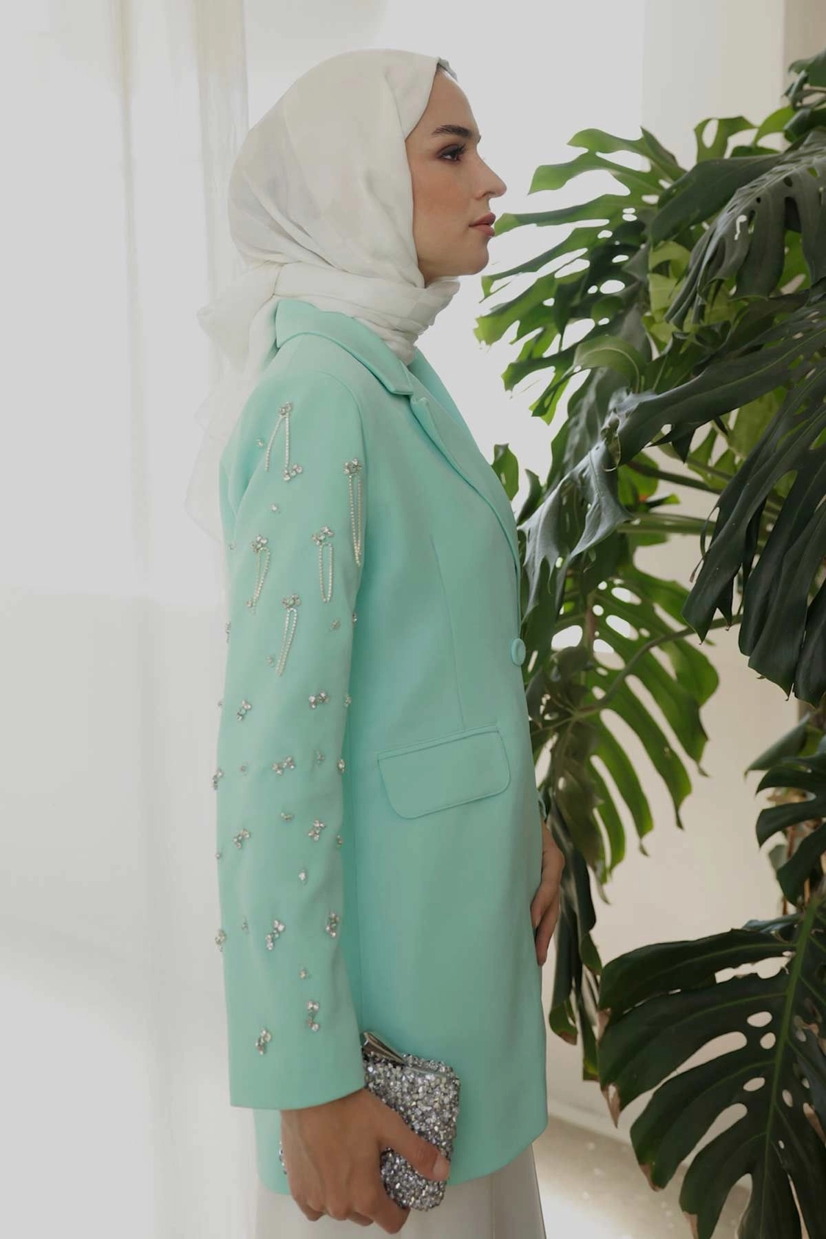Yaka Ve Kolları Taş İşlemeli Mint Yeşili Blazer Ceket
