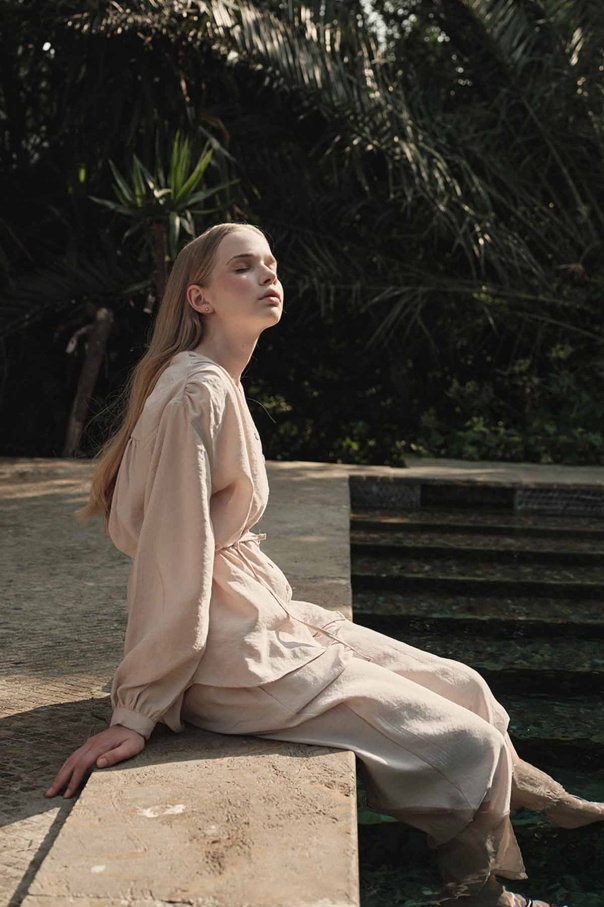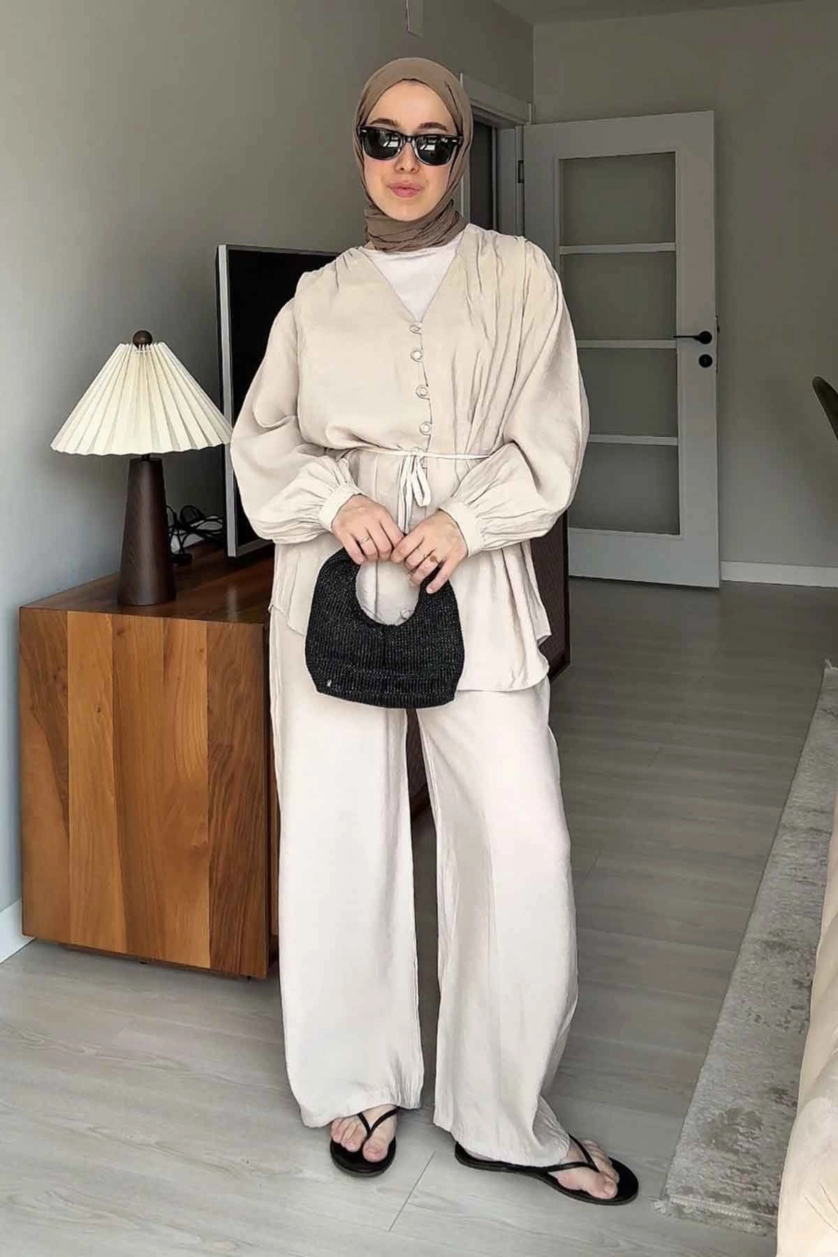 Modal Birit Düğme Detaylı Bej Pantolon Takım