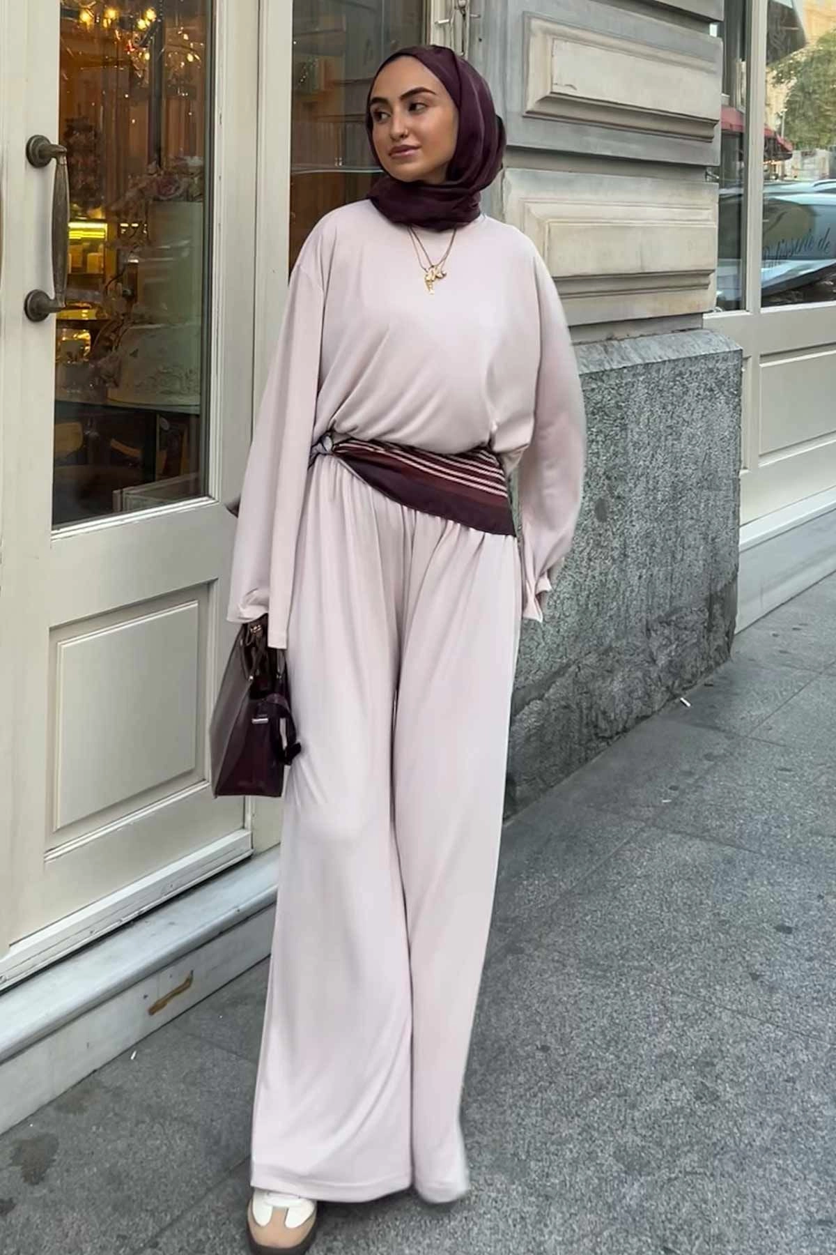 Modal İçeren Rahat Kesim Bej Pantolon Takım