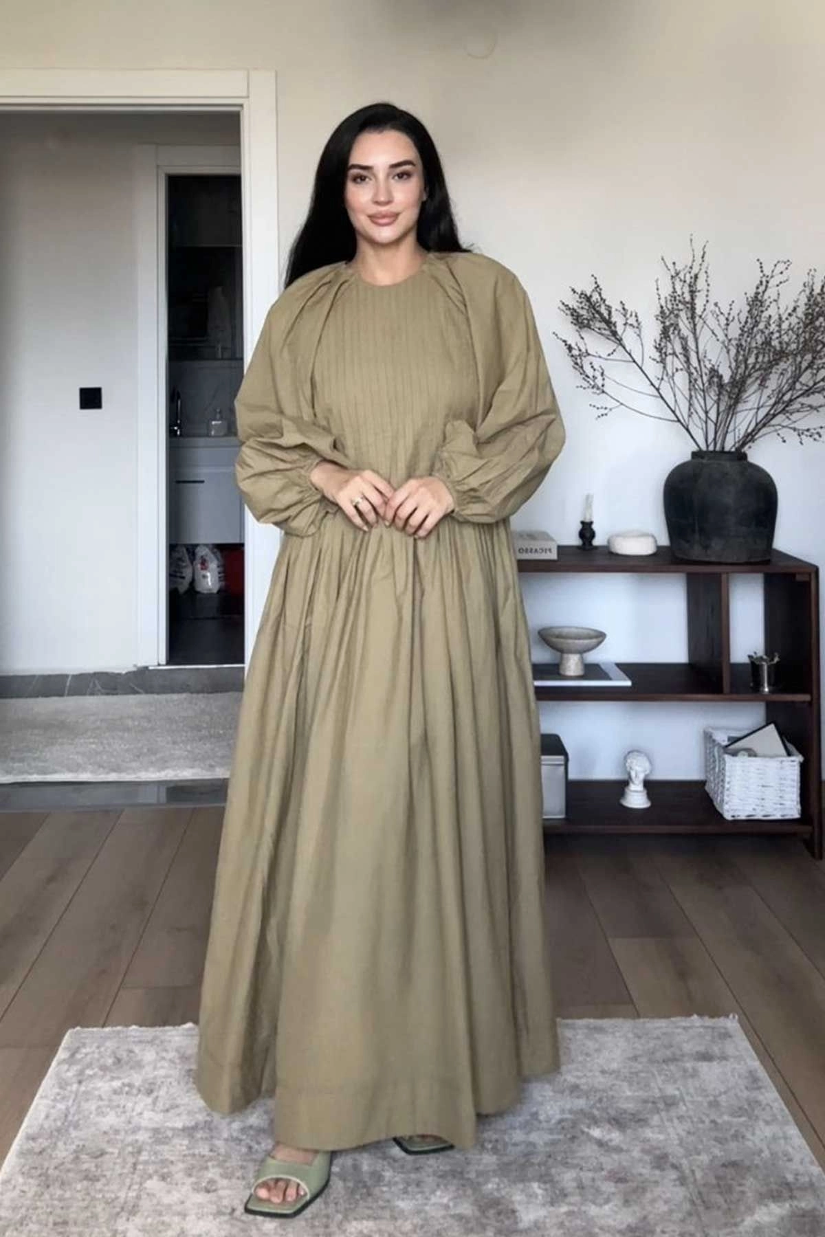 Nervürlü Pamuk Vual Ada Çayı Elbise