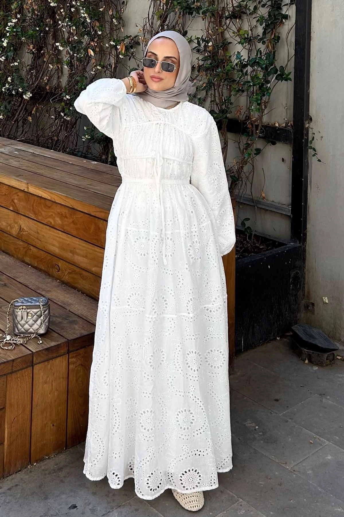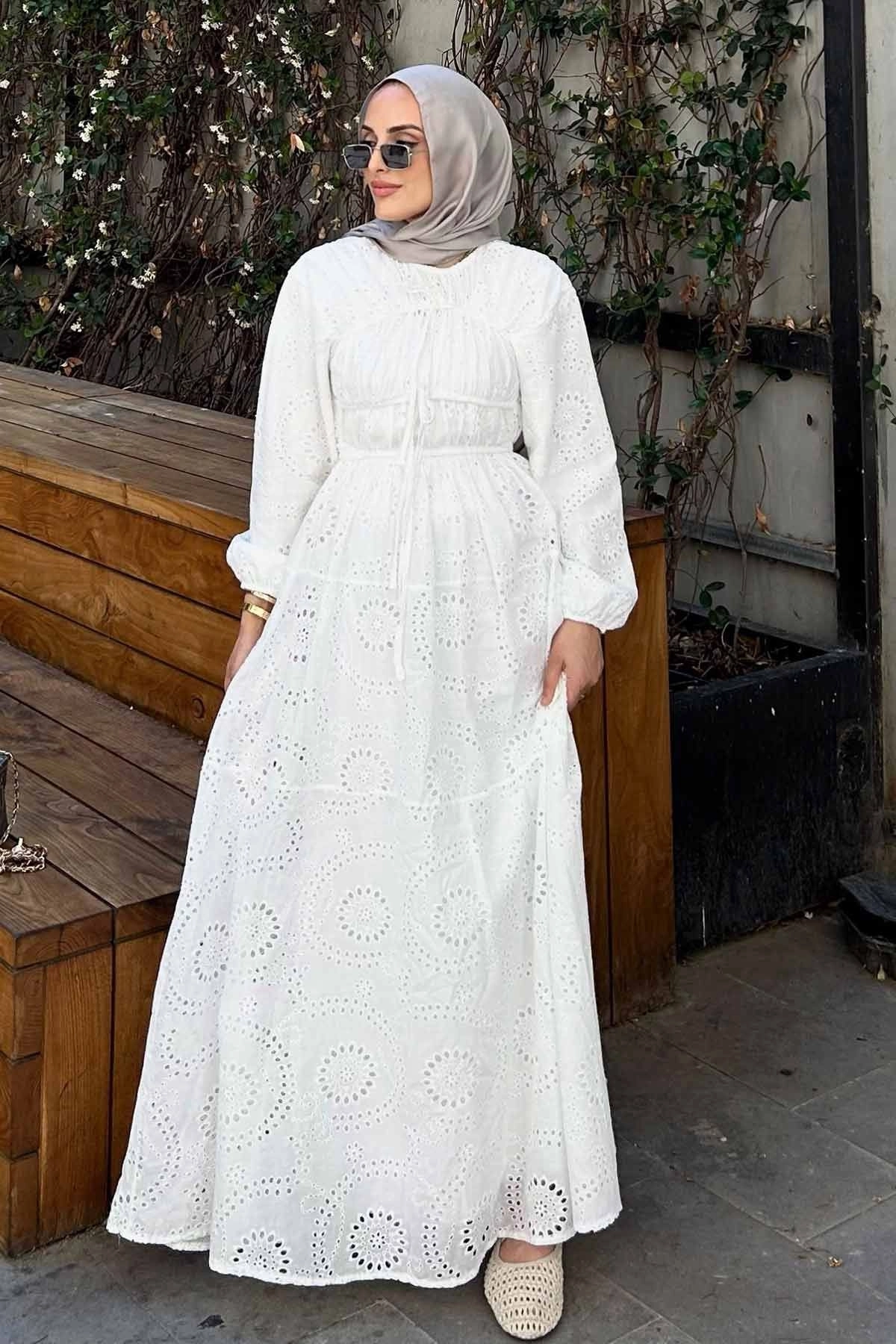 Önden Bağlama Detaylı Beyaz Petit Brode Elbise