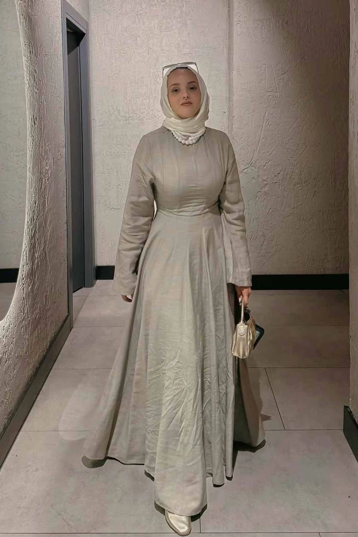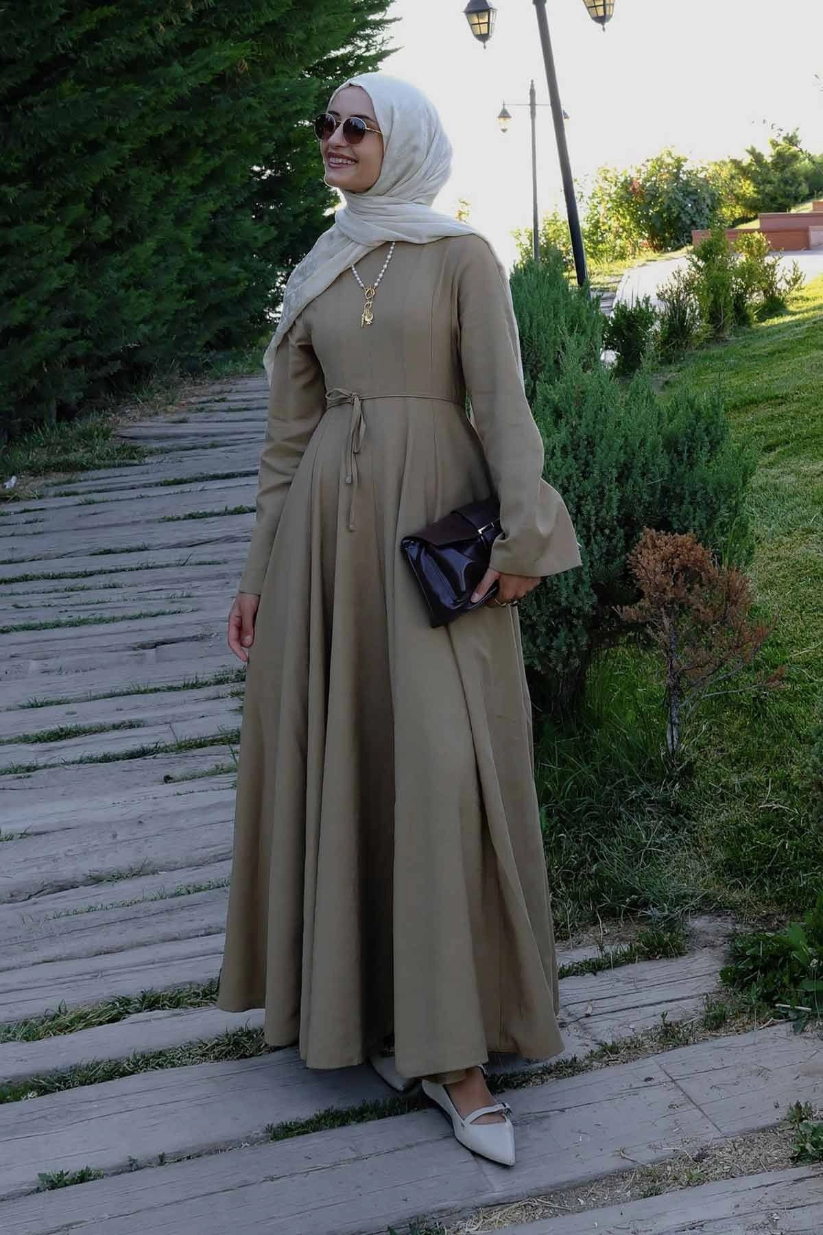 Organik Karışımlı Belden Oturma Detaylı Vizon Elbise