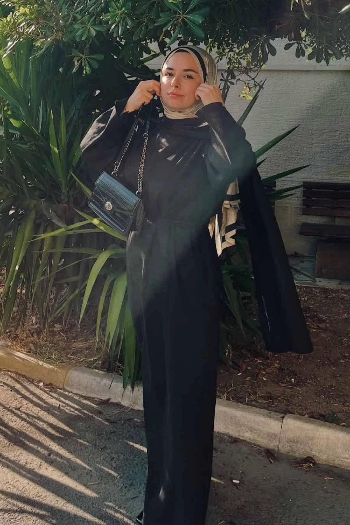 Pelerin Detaylı Lyocell Siyah Keten Elbise