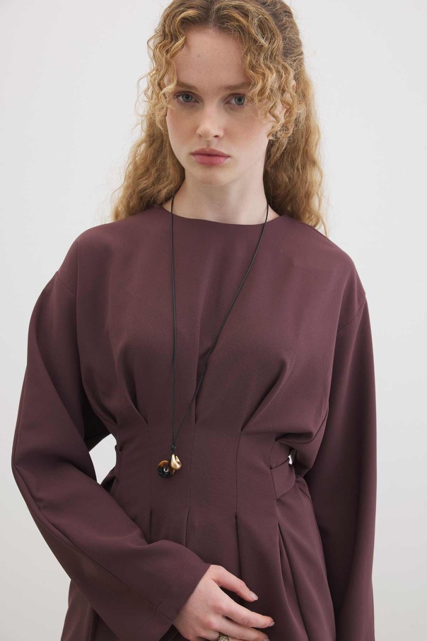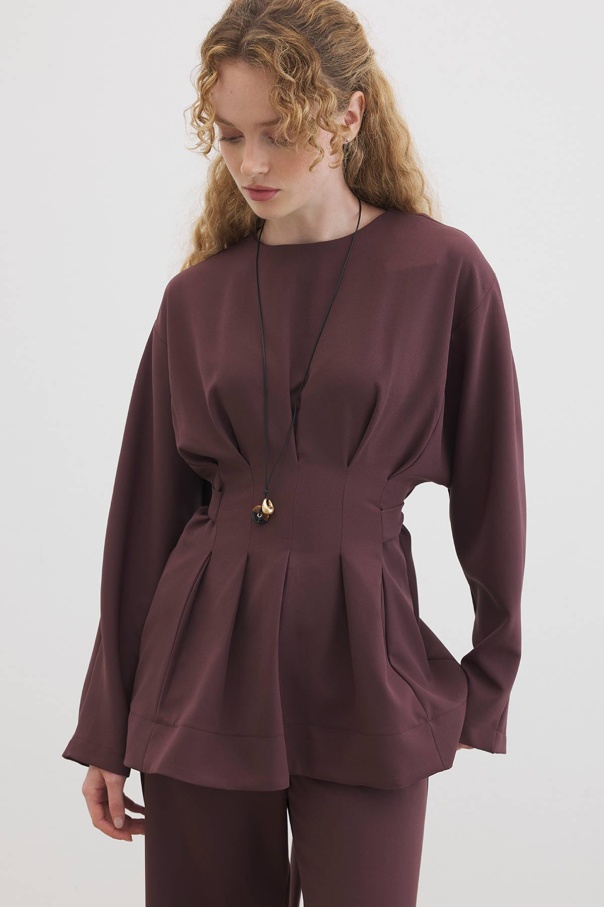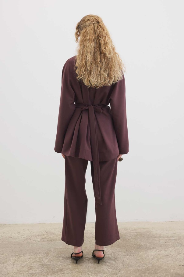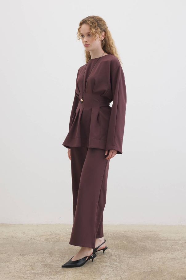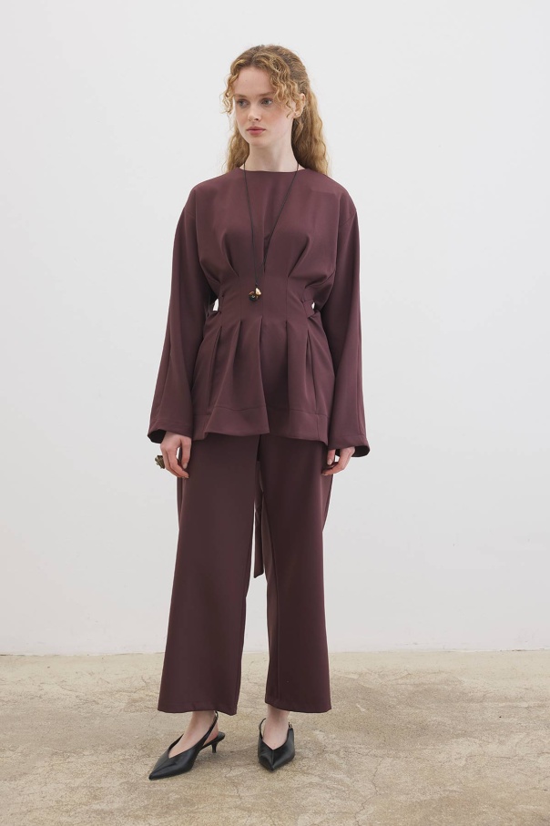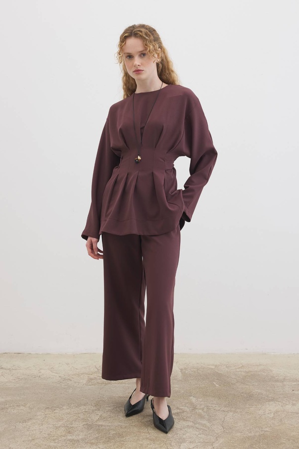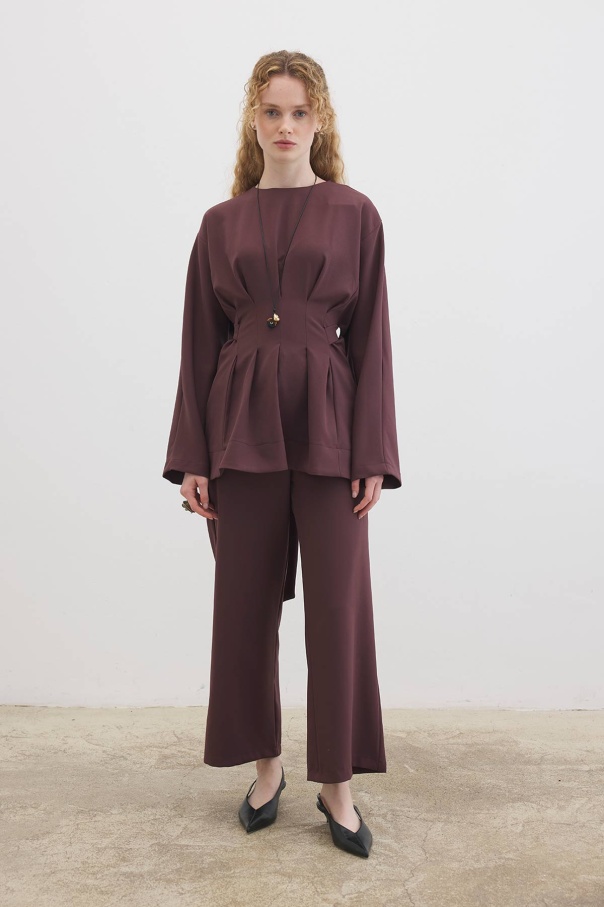 Pile Detaylı Bluz Çikolata Pantolon Takım