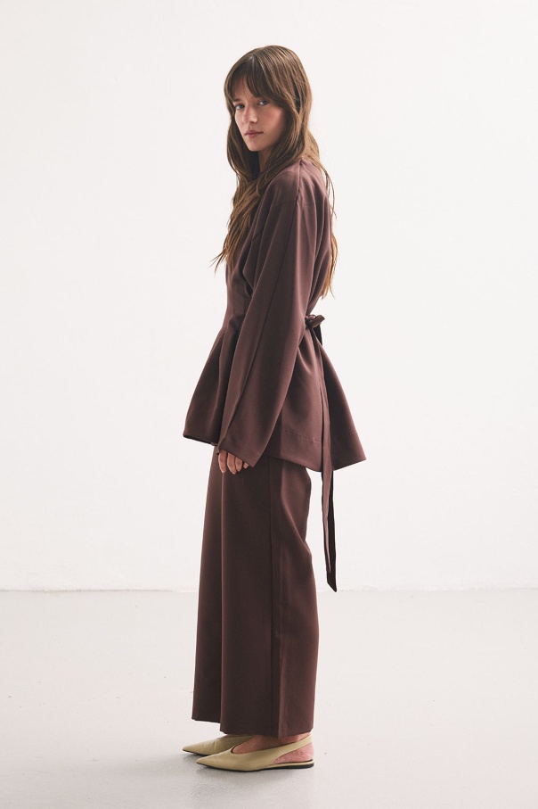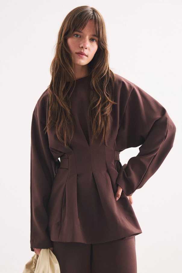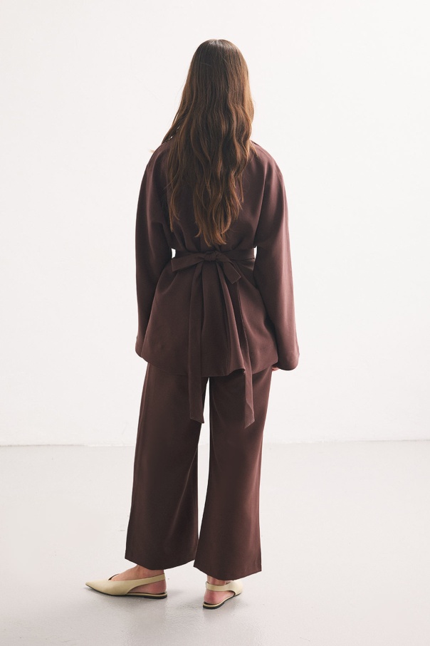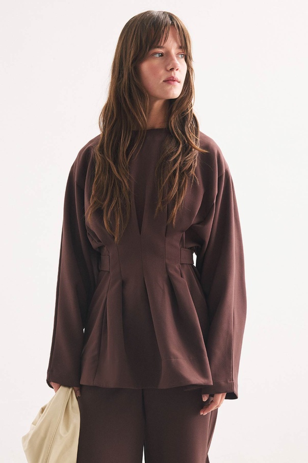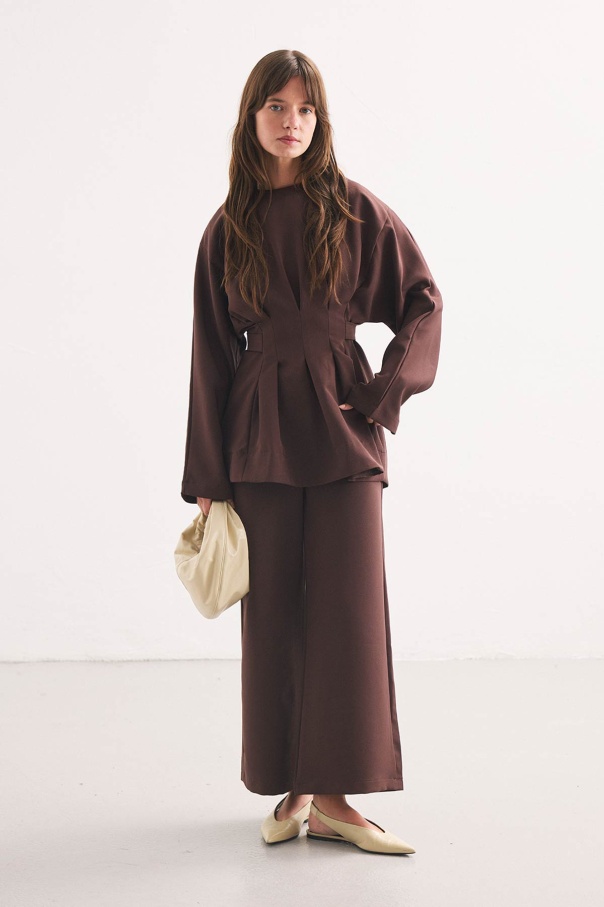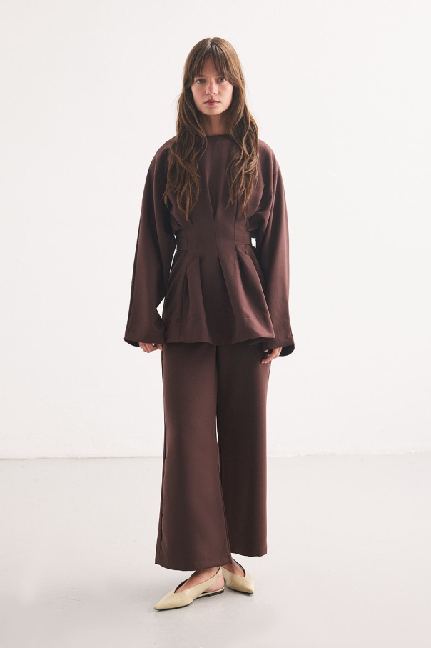 Pile Detaylı Bluz Sıcak Kahve Pantolon Takım