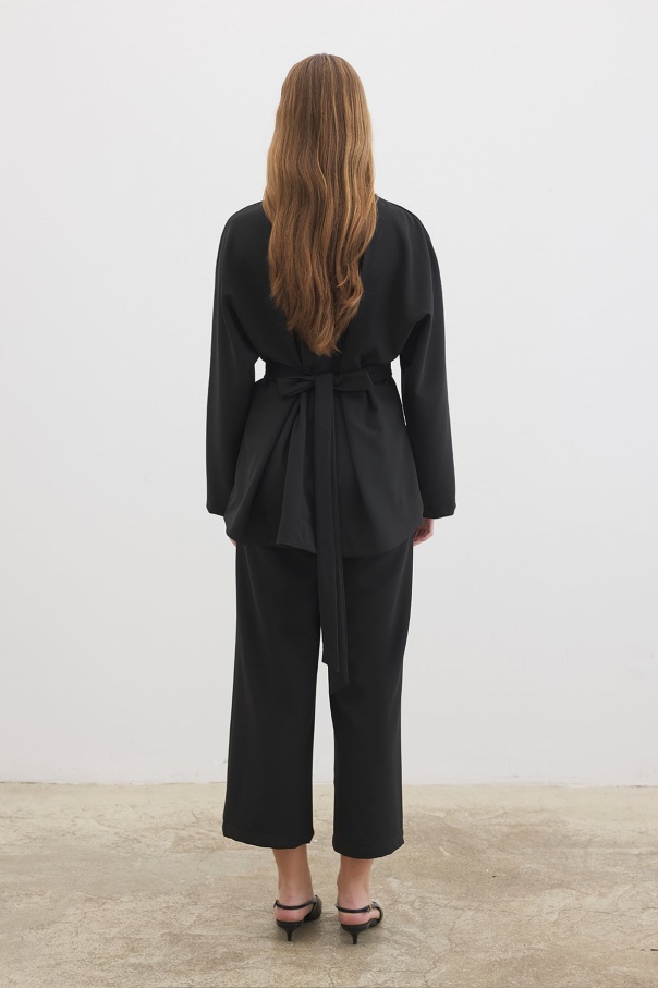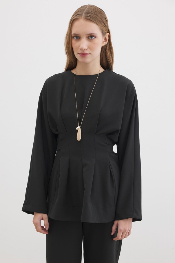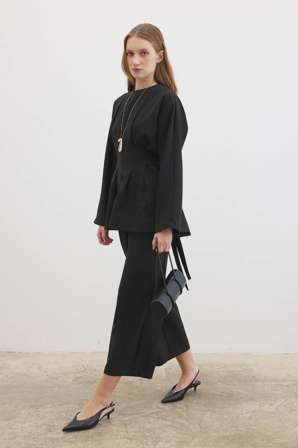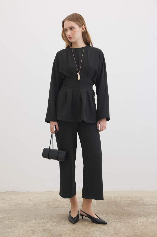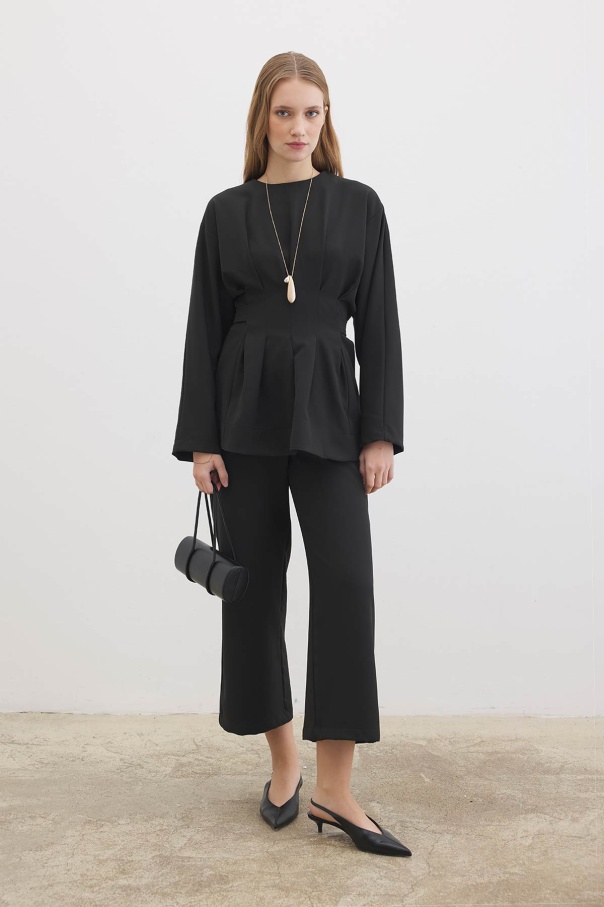 Pile Detaylı Bluz Siyah Pantolon Takım