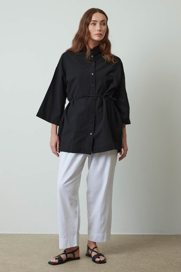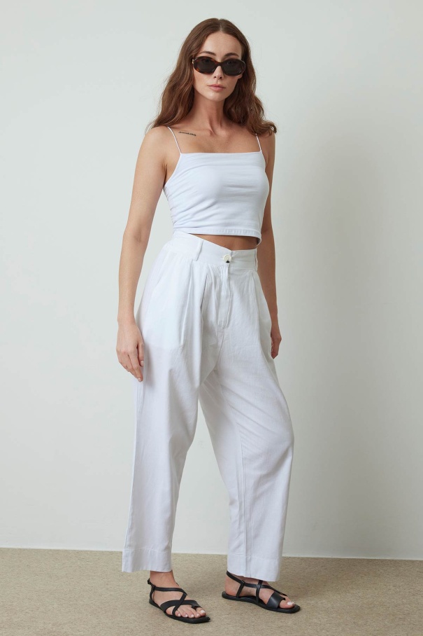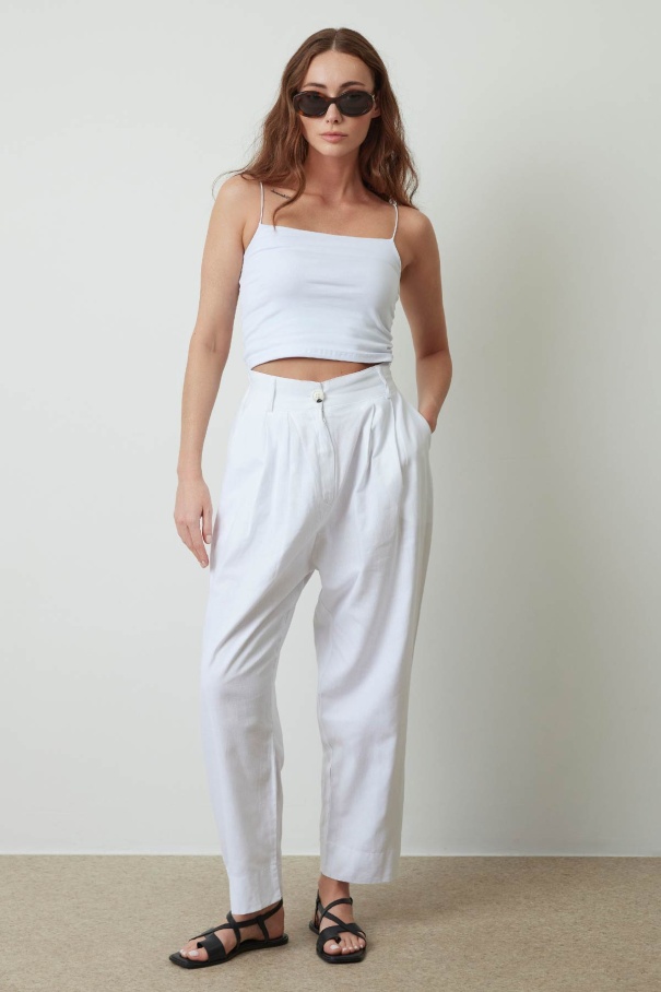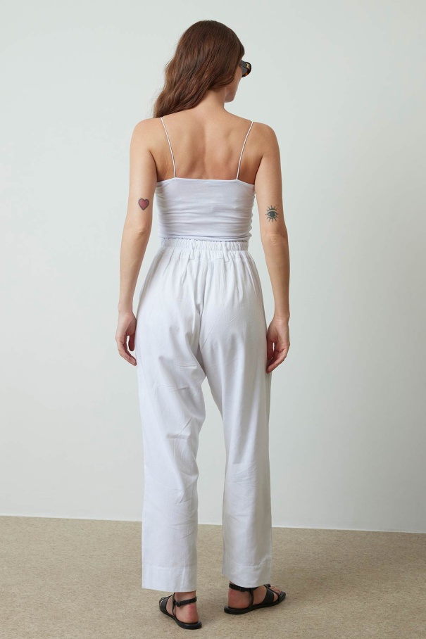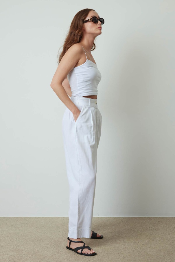 Pileli Beyaz Keten Pantolon