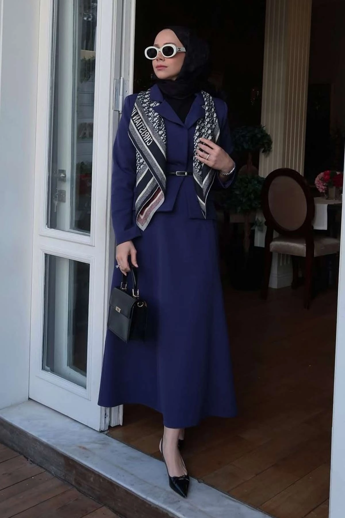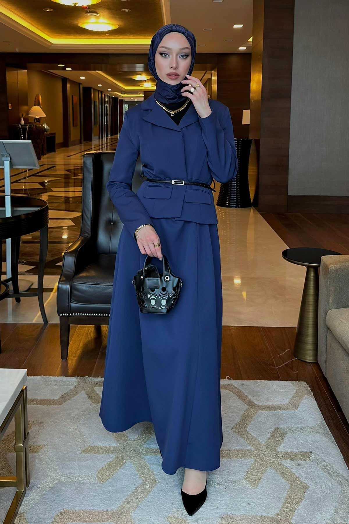 Premium Gold Kemer Detaylı Lacivert Ceket Elbise