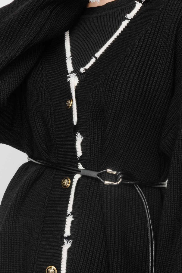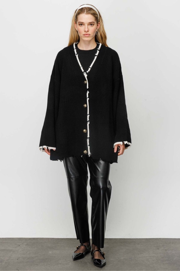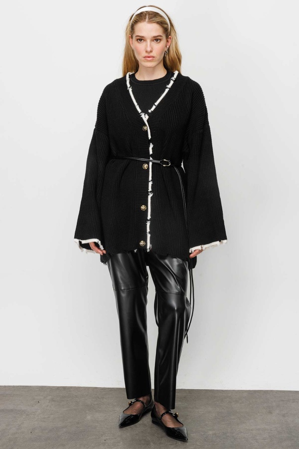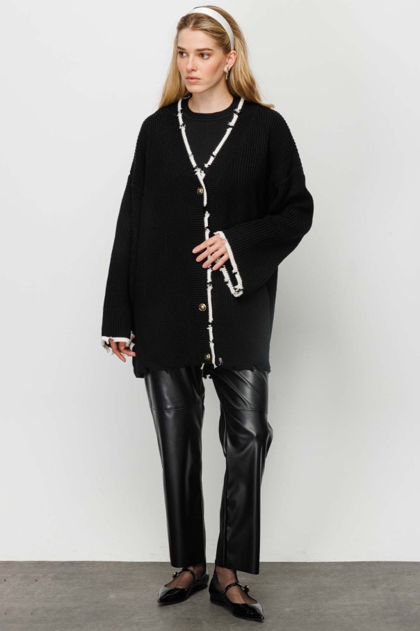 Şerit Detaylı Yırtıklı Triko Siyah Hırka