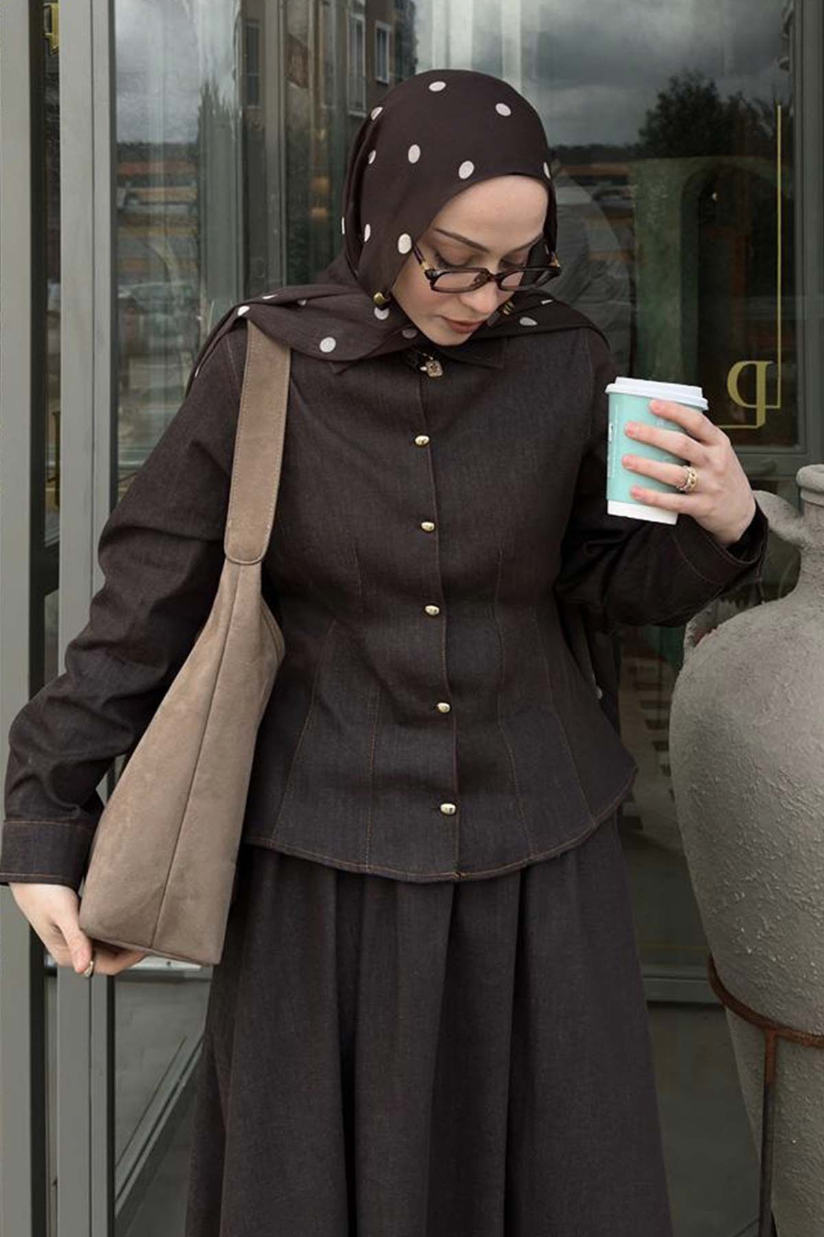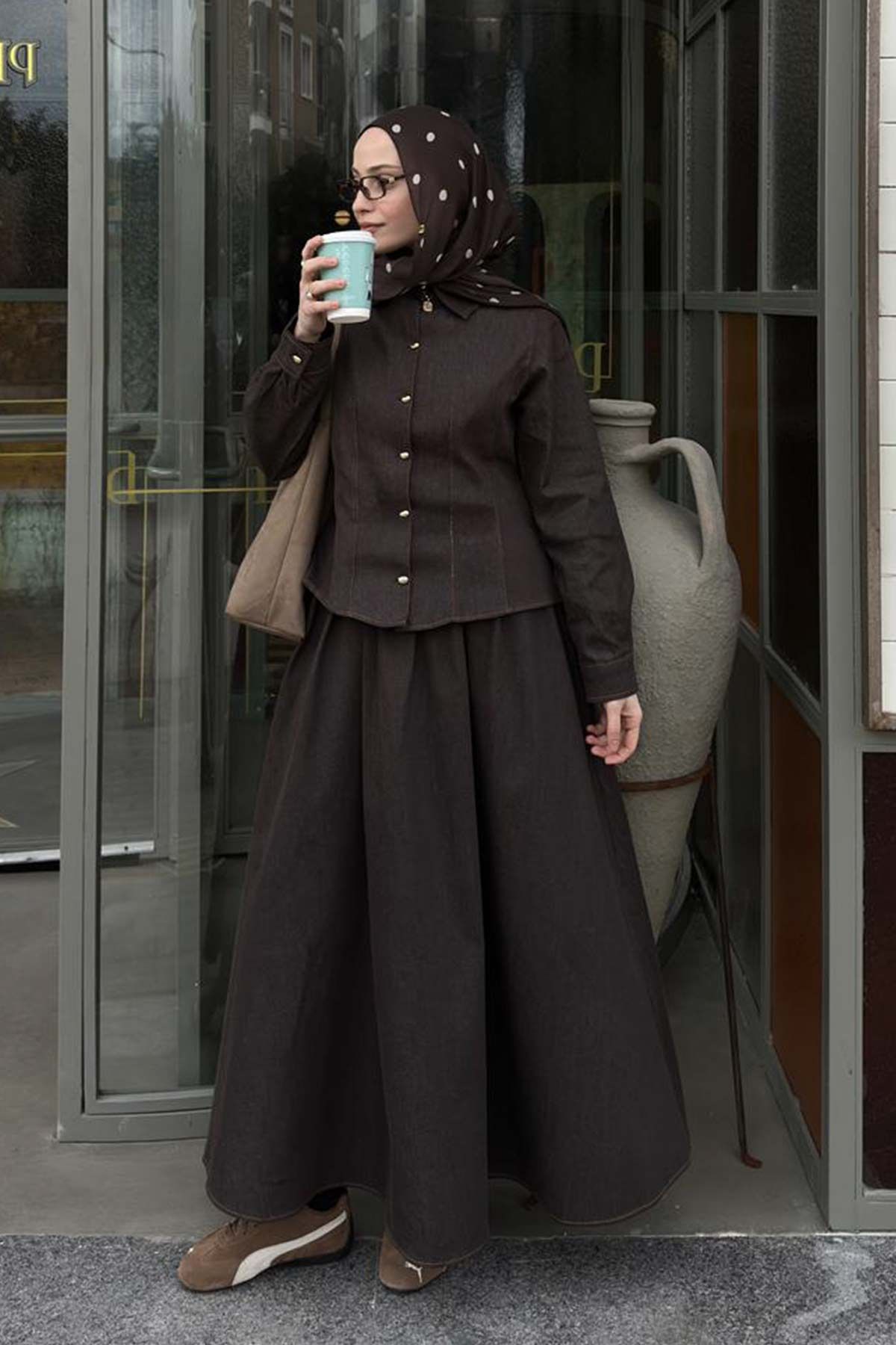 Beli Vurgulayan Denim Kahverengi Etek Takım