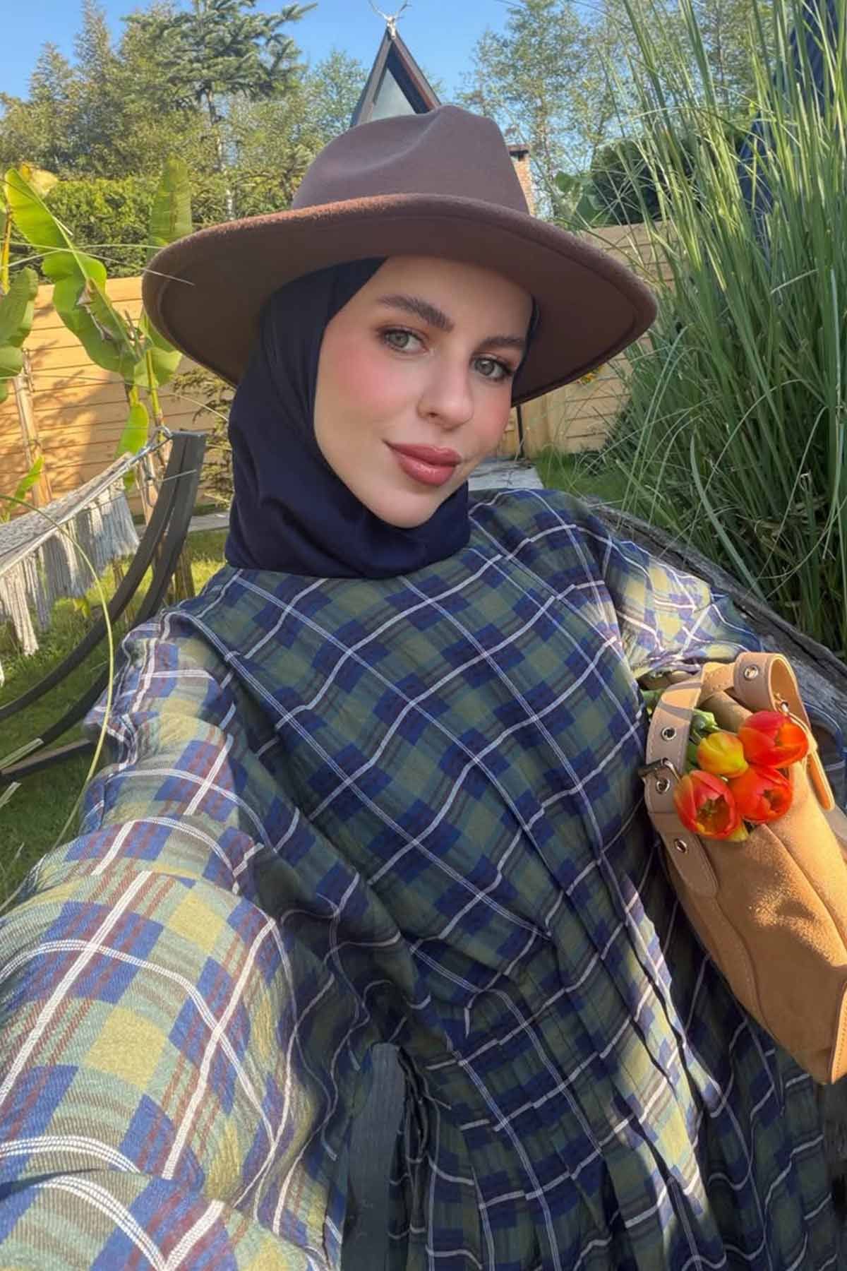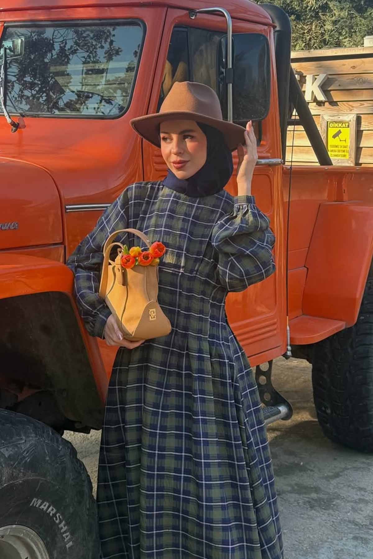 Pile Detaylı Ekose Haki Elbise