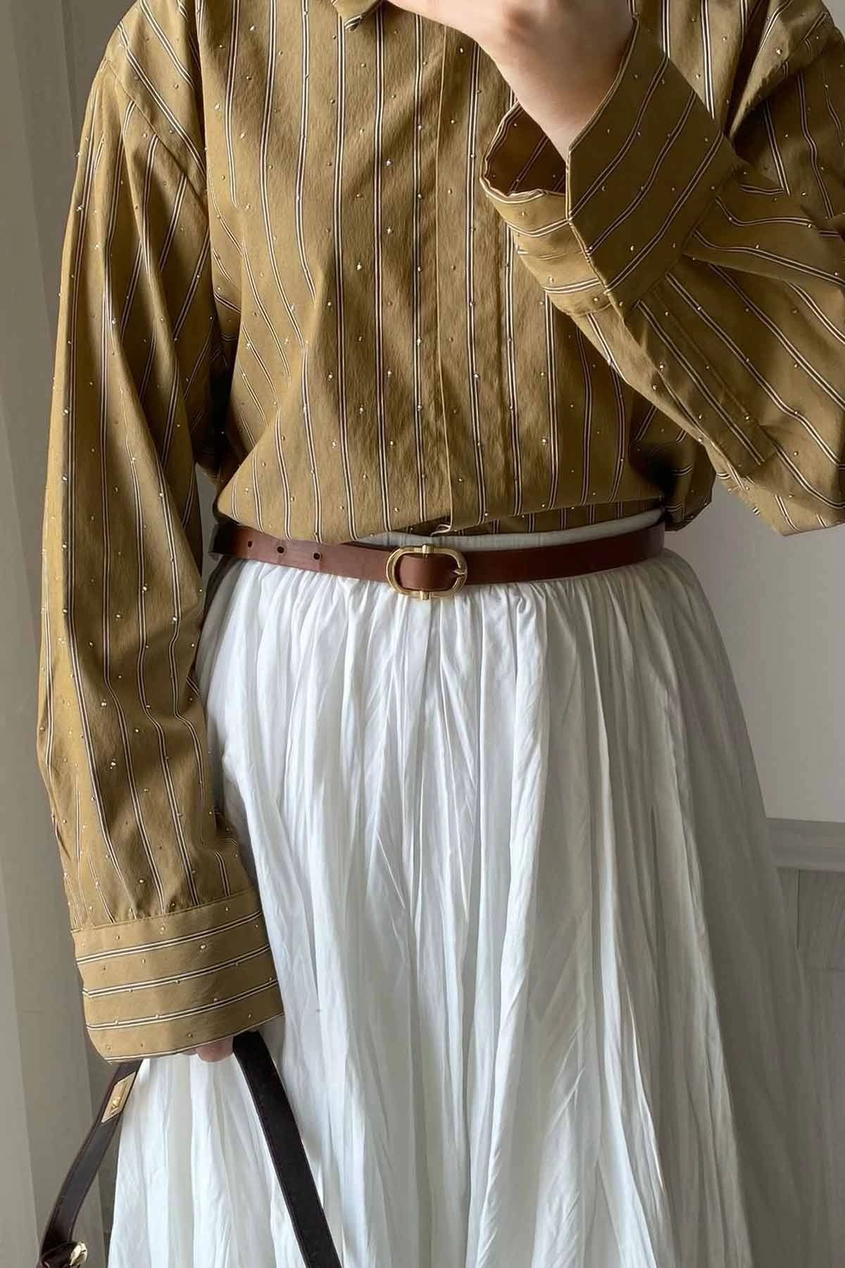 Taş İşlemeli Çizgili Camel Gömlek